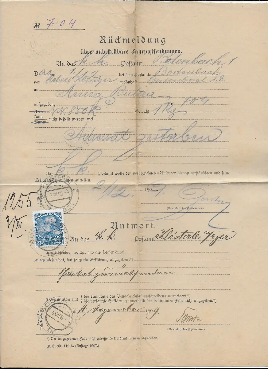 Autriche: retour d'information sur l'envoi de courriers de conduite inaccessibles 1909, Bodenbach