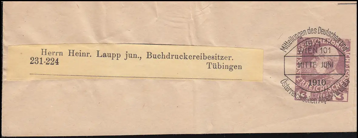 Autriche Streifband S 8 Préévaluation D.Ö.A.V. WIENNE mi-juin 1910