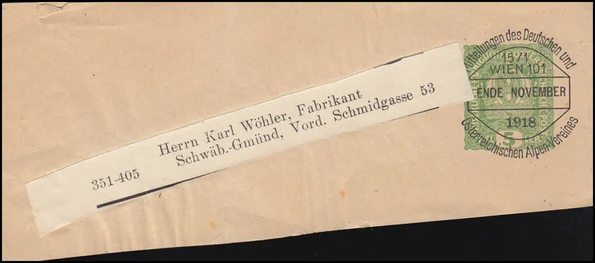 Pré-déprévalation "Messages des Alpen-Vereins Deutsche und Ausrichische Alpes - 15/1 WIENNE 101 - FIN NOVEMBRE 1918," transporté vers Schwäbisch-Gmünd / Allemagne Vérification: original Référence produit: 00000000040330>Note: Cet article n'est disponible qu'une seule fois. Vous recevrez exactement l'article représenté.