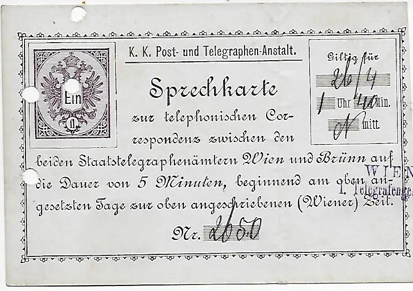 Carte téléphonique autrichienne - Carte vocale, 1889 Vienne