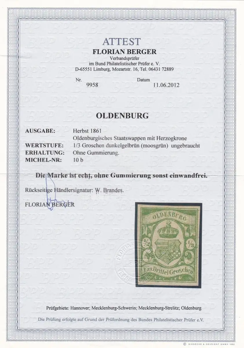 Oldenburg: Michel n° 10b, sans caoutchouc, BPP Attest