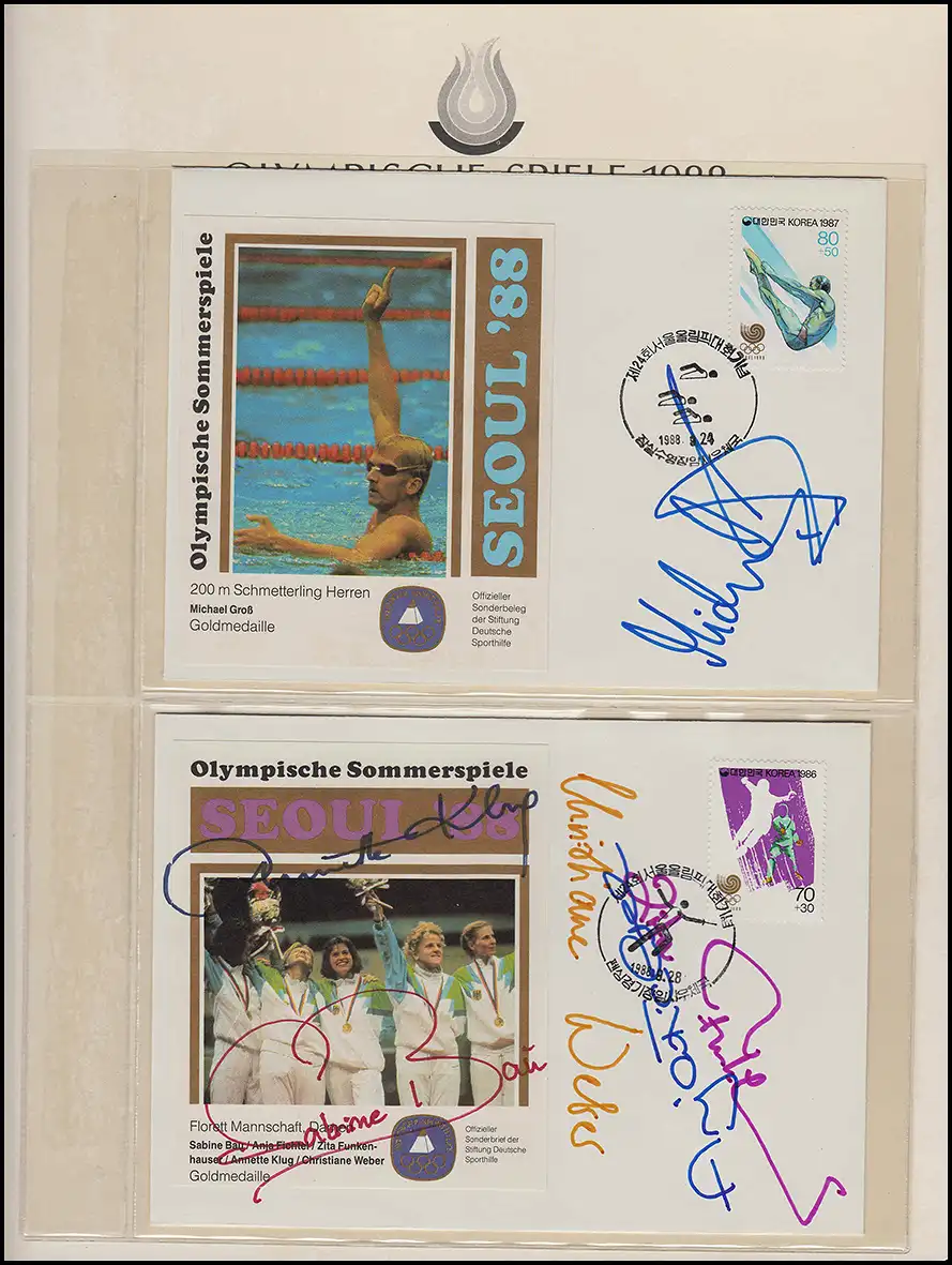 Lettres spéciales officielles de la Fondation Deutsche Sporthilfe. Médaille d'or Papillon Hommes: Michael Gross, Séoul 24.9.1988. Gold Madeille Florett Equipe Dames, Seoul 28.9.1988 Examen: original Référence produit: 00000000053124