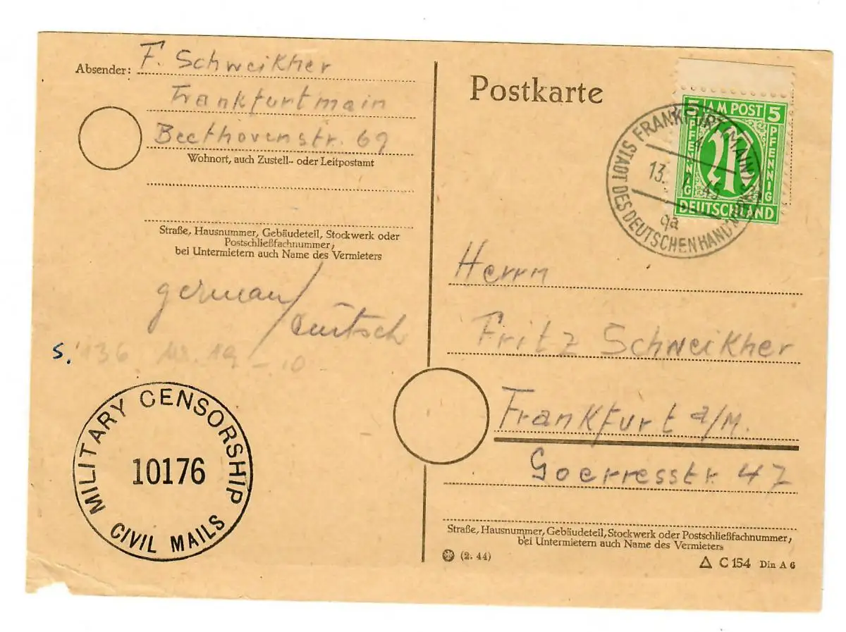 Carte postale locale Francfort/M 13.7.45, Military Censor Mi Nr. 3
