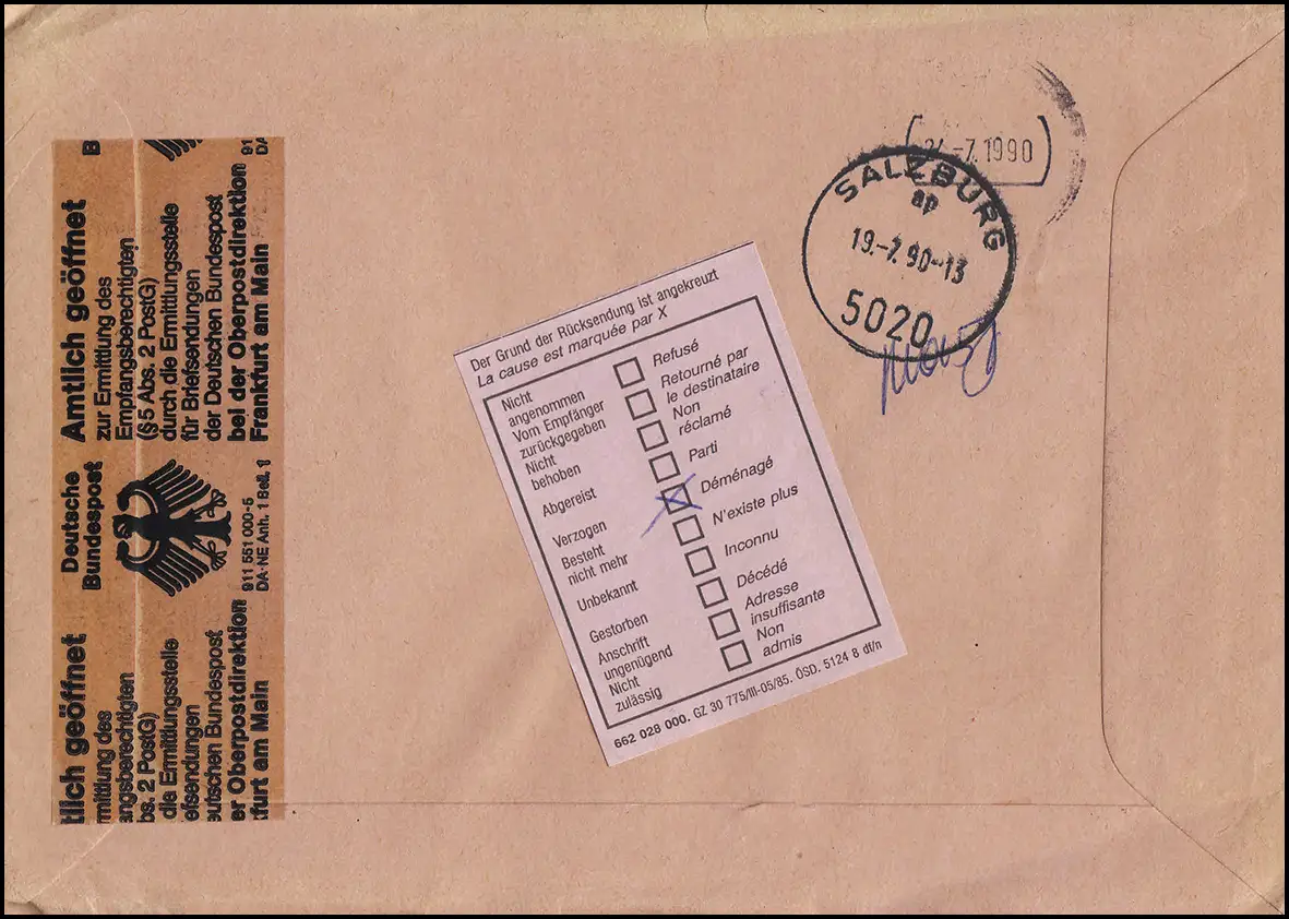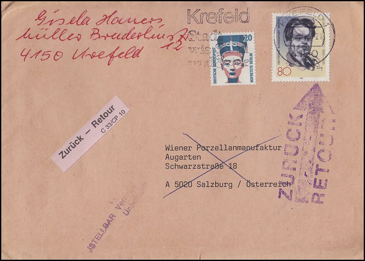Lettre de KREFELD 17.7.1990 non accessible en Autriche: mention "défilée" retour en Allemagne avec cachet officiel "Deutsche Bundespost - Ouvert officiellement ... " pour le calcul de l'expéditeur; en haut à gauche avec indication de la lettre rouge de livraison déterminée Contrôle: original Référence de produit: 00000000032033>Note: Cet article n'est disponible qu'une seule fois. Vous recevrez exactement l 'article représenté.