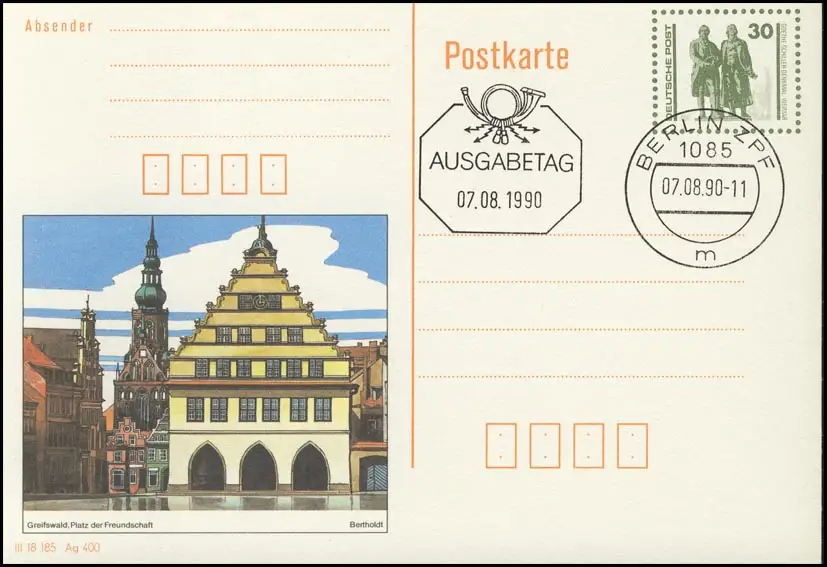 P 109/1 Goethe/Schiller: Greifswald 1990 30 Pf, VS-O Berlin ZPF 7.8.90