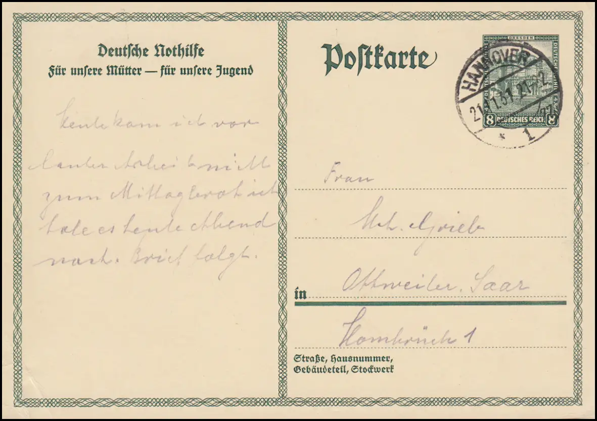 P 212II Aide d'urgence allemande Dresdner Zwinger 8 Pf HANNOVER 1 zz 2.11.1931