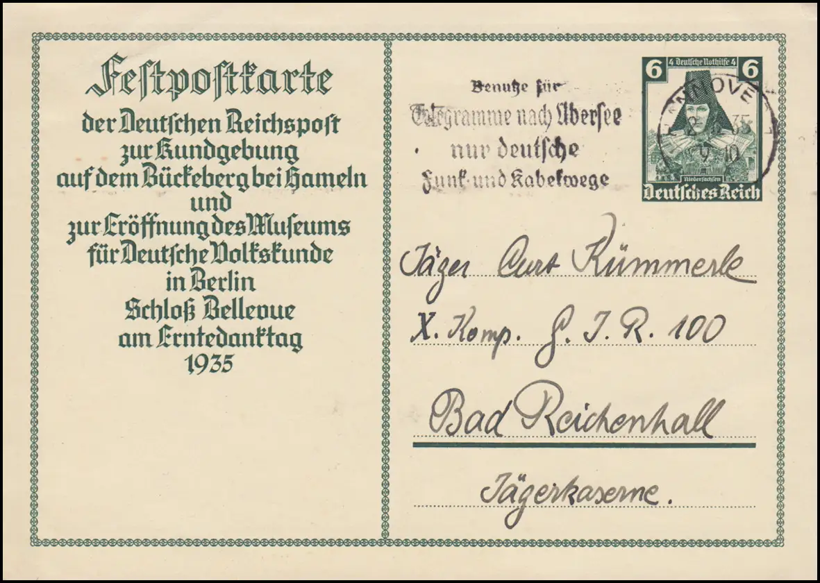 P 255 Merci aide d'urgence costumes, publicité O télégrammes d 'outre-mer HANNOVER 2.12.1935