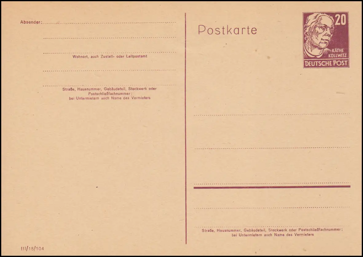 P 44a Kollwitz 20 Pf, brun violet, frais