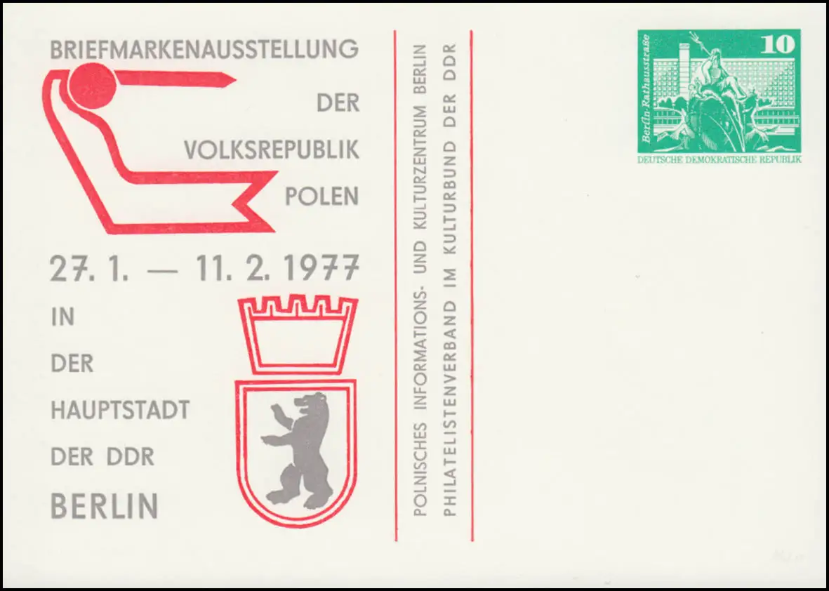 Exposition des timbres de la République populaire de Pologne à Berlin 1977 / Figure: Armoiries de Varsovie et Berlin N° de catalogue: PP15/73 Examen: original Référence produit: 47056001573100>p>Attention: Cet article est ou a été répété. La figure montre l'un de ces articles en un exemplaire. Cette marque fournie a uniquement les caractéristiques indiquées dans la description et peut donc différer de celle-ci. Toutefois, en particulier pour les marques marquées, nous nous efforçons de fournir l ' article illustré. Si cela est une condition pour vous, veuillez nous le faire savoir.