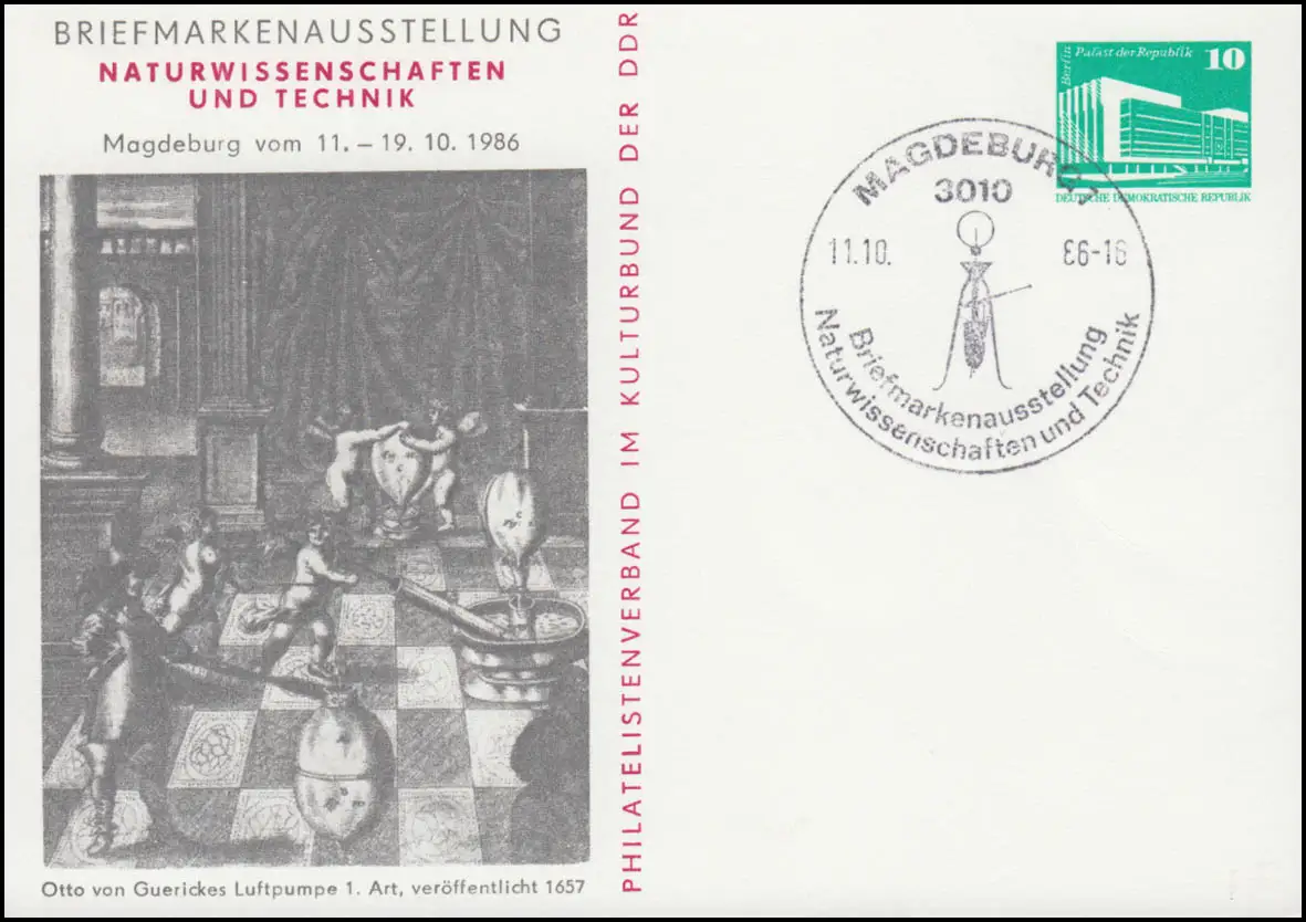 Exposition des timbres Sciences naturelles et Technique Magdeburg 1986 / Figure: Otto von Guerickes Pompe à air 1. Art, publiée 1657 N° de catalogue: PP17/65 Examen: original Référence produit: 47056001765200>Attention: Cet article est ou a été disponible plusieurs fois. L'illustration montre l'un de ces articles en un exemplaire. La marque fournie a les caractéristiques indiquées dans la description et peut donc différer de l ' image. Toutefois, en particulier pour les marques marquées, nous nous efforçons de fournir l l\'article représenté. Si cela vous convient, veuillez nous le faire savoir.