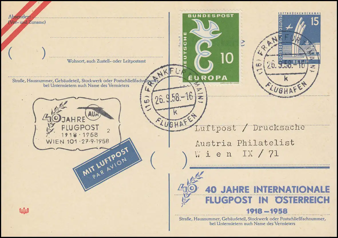 PP 19 - Pression 40 ans de courrier aérien en Autriche, cachet supplémentaire, FfM 26.9.58