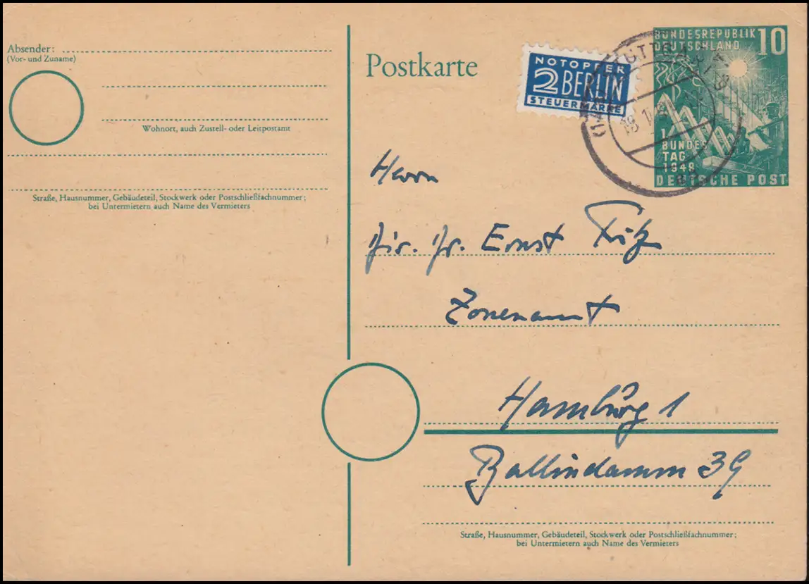 PSo 1 Reidfest et Bundestag 10 Pf avec sacrifice d'urgence STUTTGART 18.1.50 à Hambourg