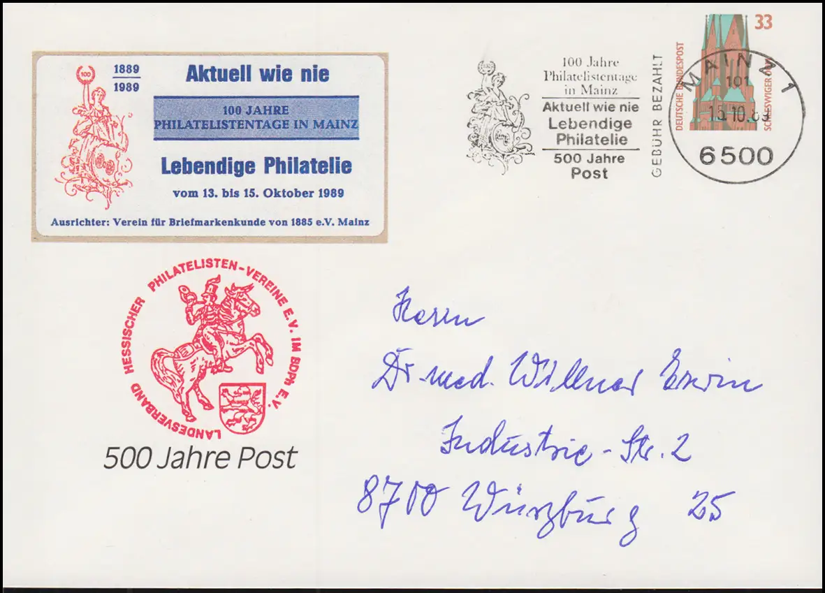 Enveloppe de Schmcuk Actuellement comme jamais 100 ans Journées Philatélistes à Mayence / L'Exposition Philatelie Vivante 1989 / 500 ans Post / Le cachet de la bannière nationale - avec un cachet publicitaire "6500 MAINZ 1 Actualités comme Jamais / Phlatelie vivante /500 ans post 15.10.89" N° de catalogue: PU282 Examen: original Numéro d'article: 01.0161143>p>Remarque: Cet article n'est disponible qu'une fois. Vous recevrez exactement l'élément représenté.