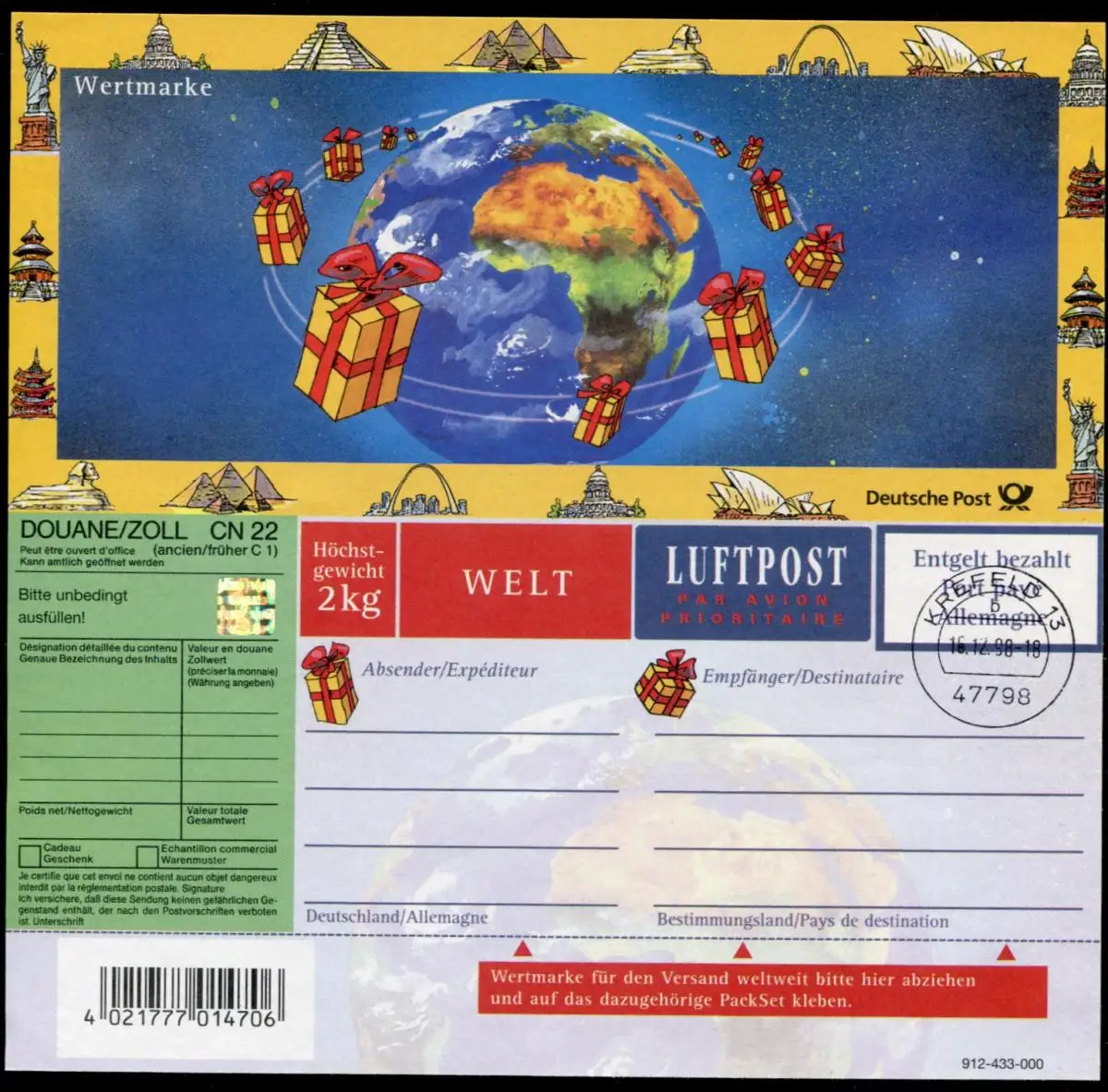 Voir catalogue des affaires générales de MICHEL Section "Passeaux et colis": PZ 3/2 et PC 8/2 ont été remis en décembre 1998. - Ici le 16.12.98 à Krefeld avec reçu de premier jour Numéro de catalogue: Pz8/02 Vérification: original Numéro d'article: 00000000012221>p>Remarque: Cet article n'est disponible qu'une seule fois. Vous recevrez exactement l'élément représenté.