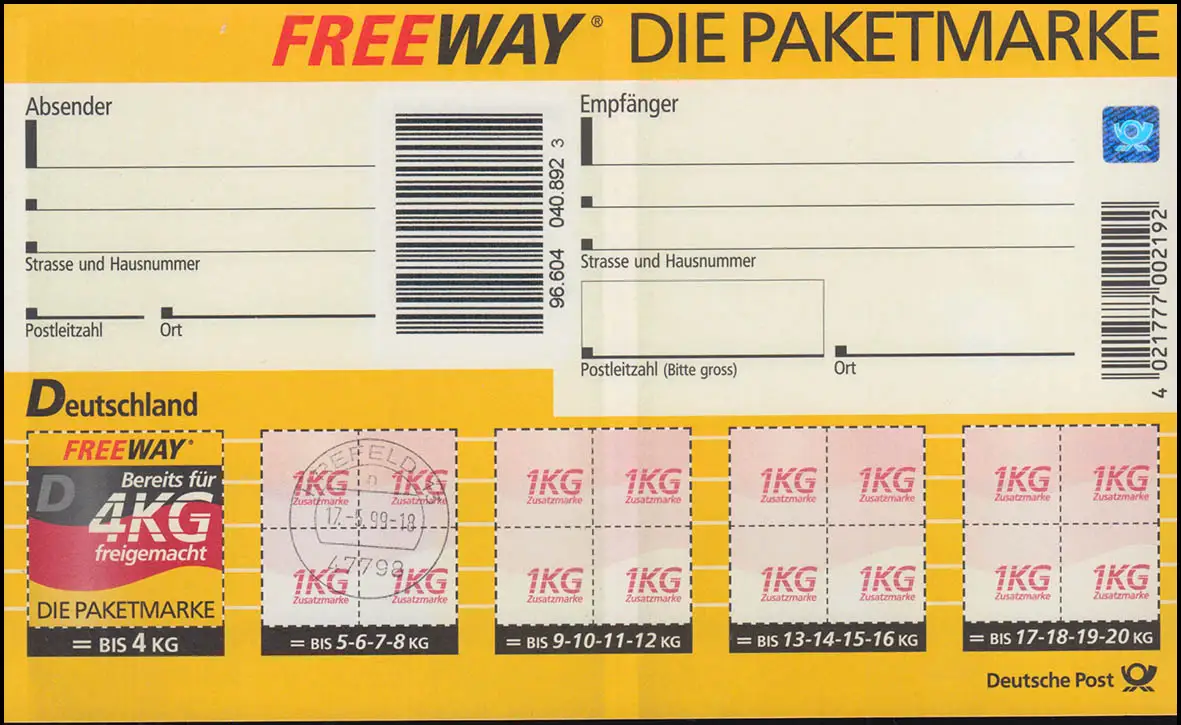 Adresse de la liste des colis PZ 9 Freeway D 4 KG, cachet du premier jour KREFELD 17.5.99