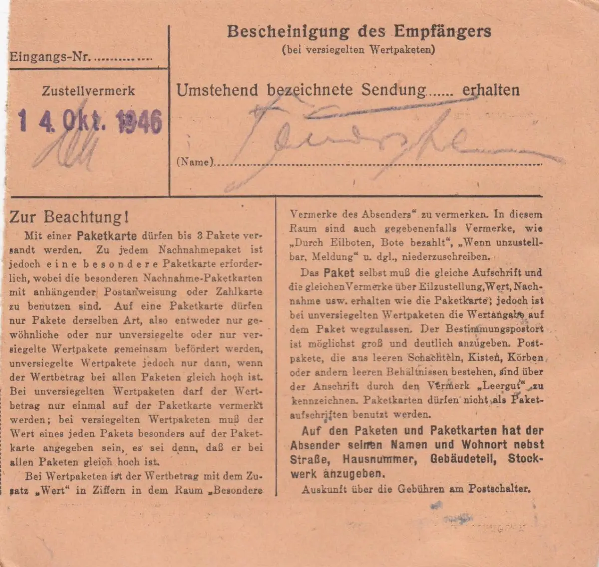 Carte de paquet 1946: Oberstdorf vers Bad Aibling, carte de valeur