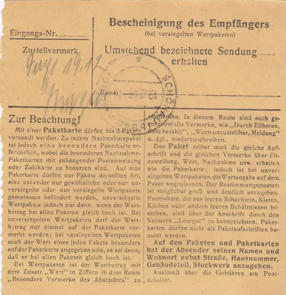 Carte de paquet 1946: Taufkirchen près de Munich vers Schönau, carte de valeur