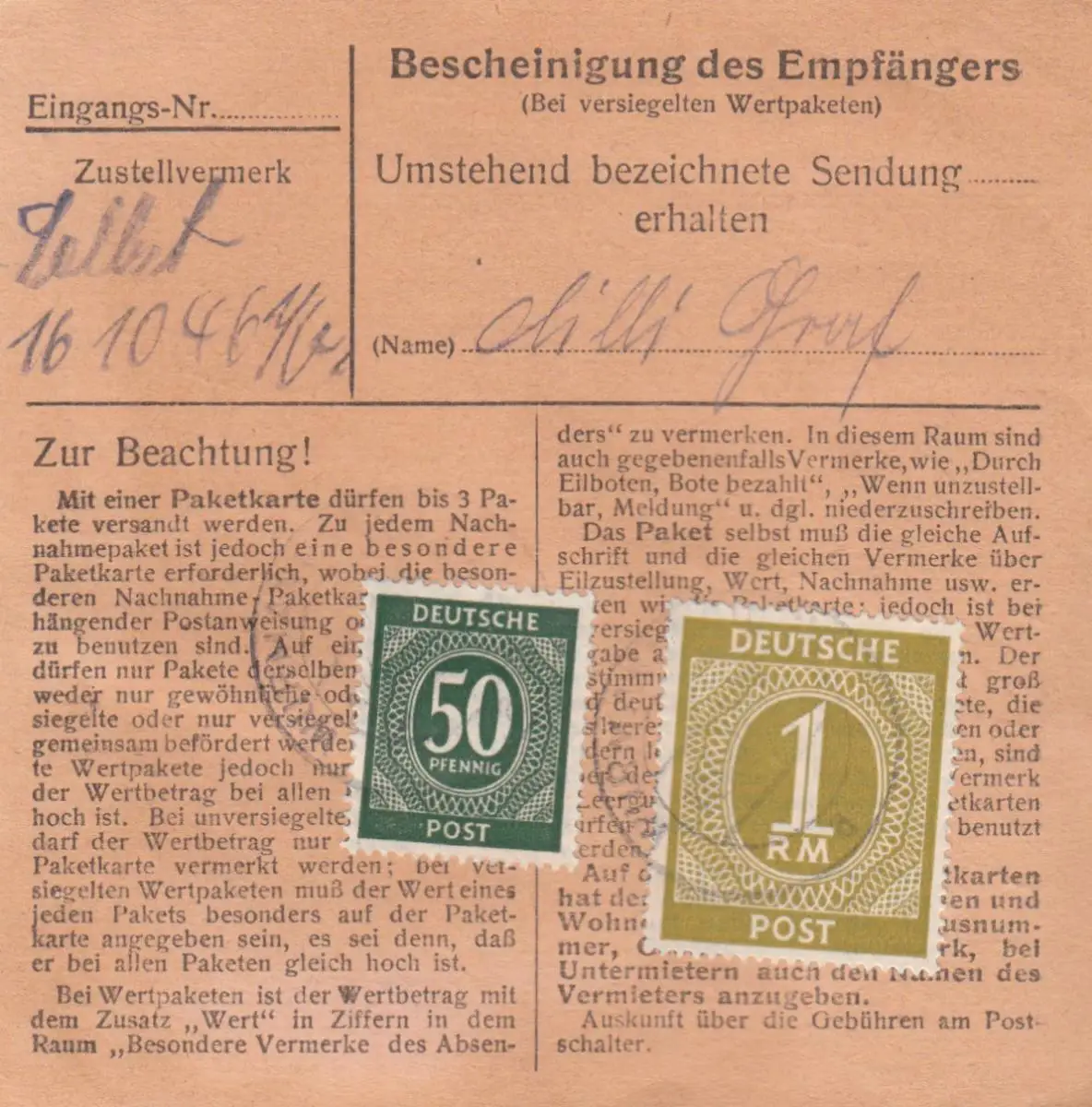 Carte de paquet 1946 Wurmannsquick via Eggenfelden vers Bad Aibling, Eilboten