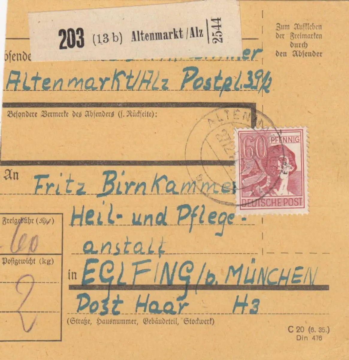 Carte de paquet 1947: Altenmarkt après Eglfing, Hôtel de santé