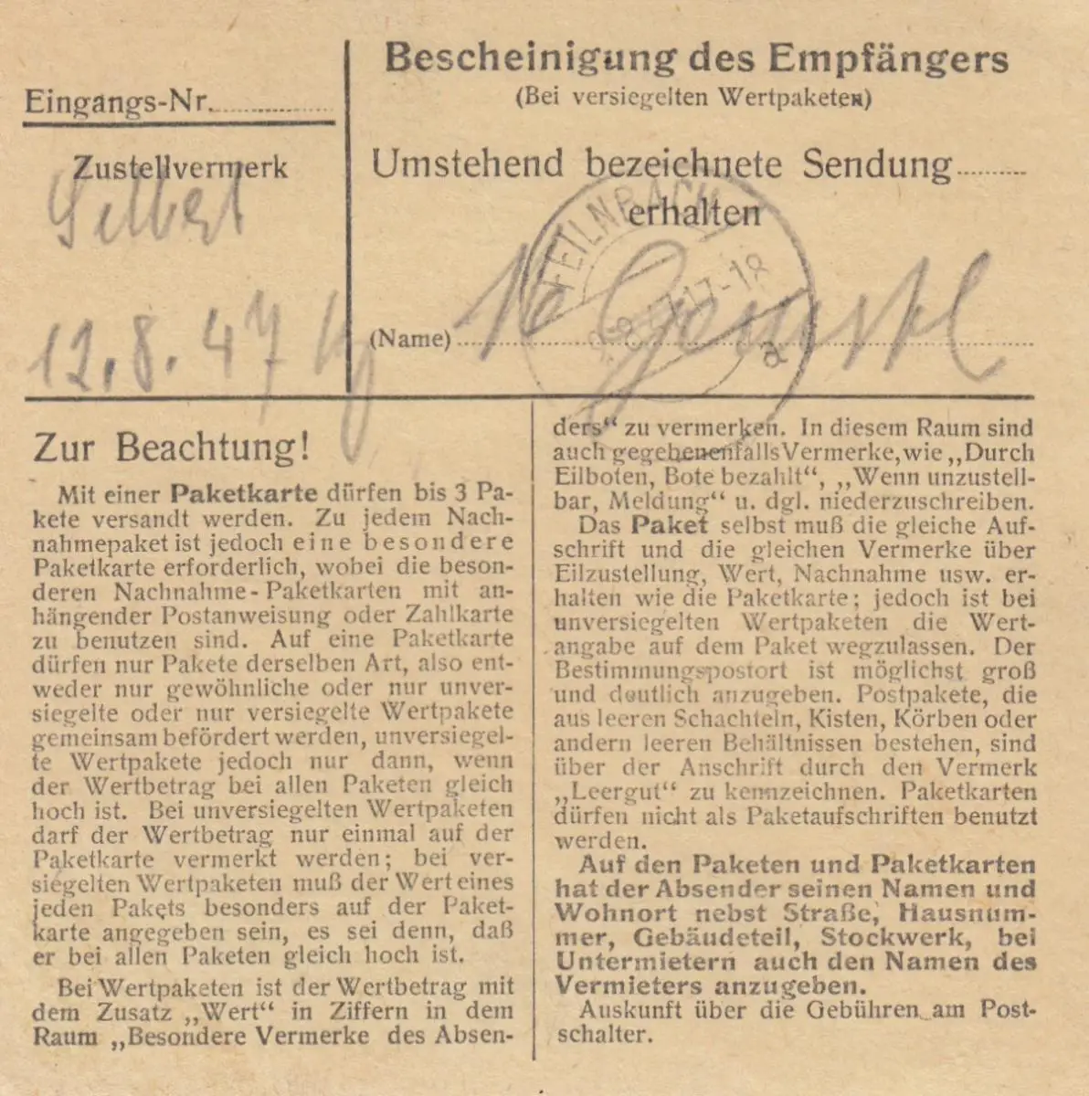 Carte de paquet 1947: Bad Aibling vers Feilnbach, carte de valeur