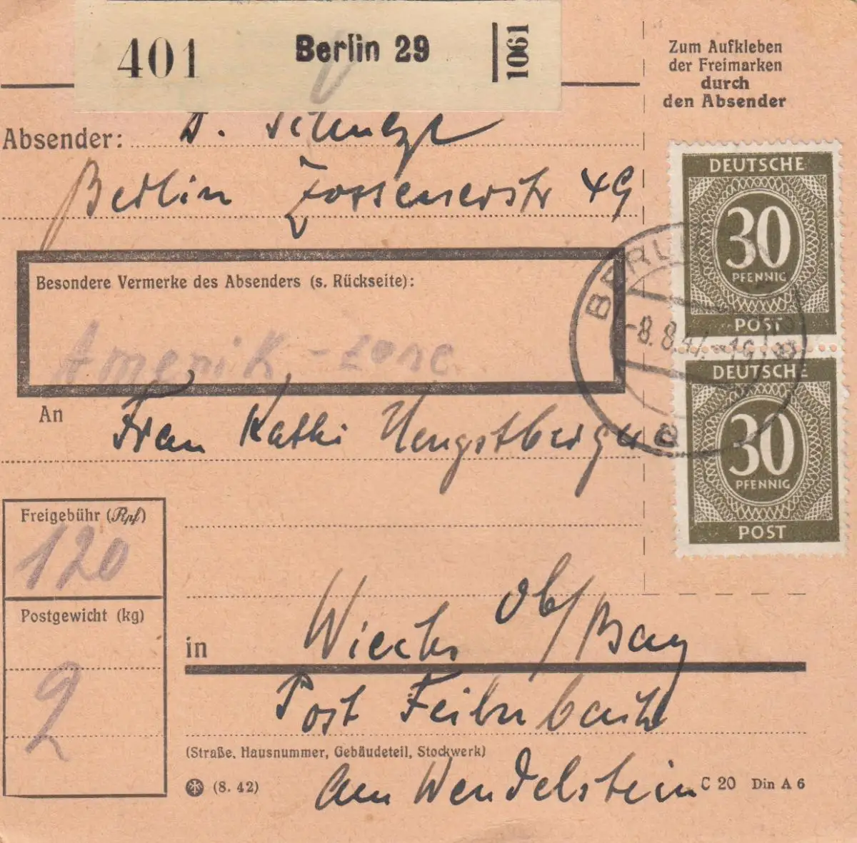 Carte de paquet 1947: Berlin 29 vers Wiechs Post Feilnbach, Wendelstein