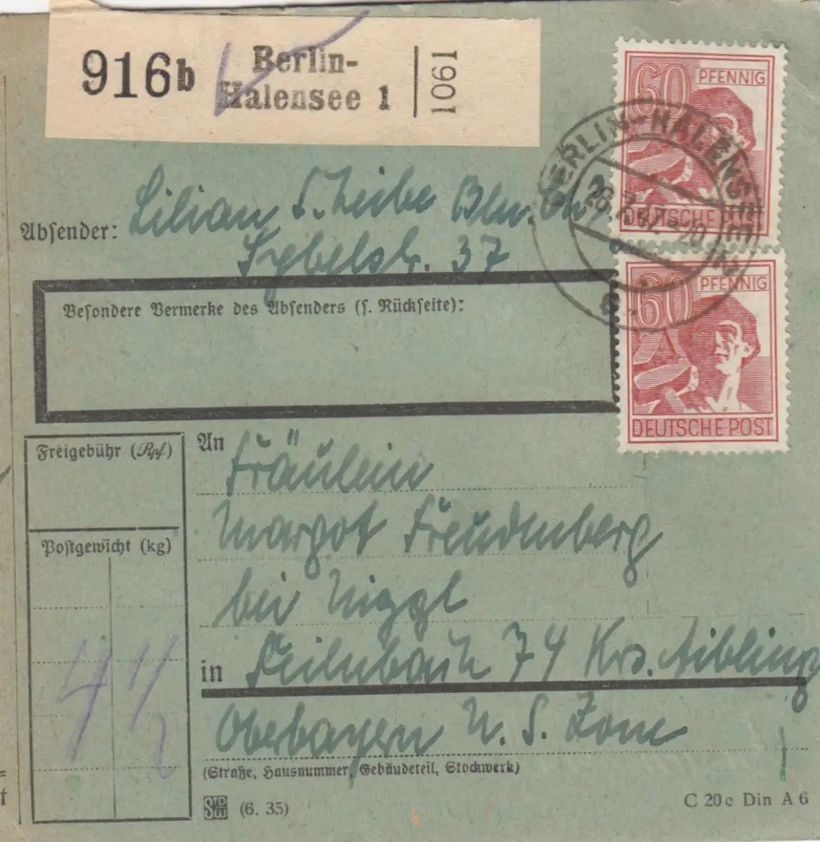 Carte de paquet 1947: Berlin-Halensee vers Feilnbach, formulaire spécial