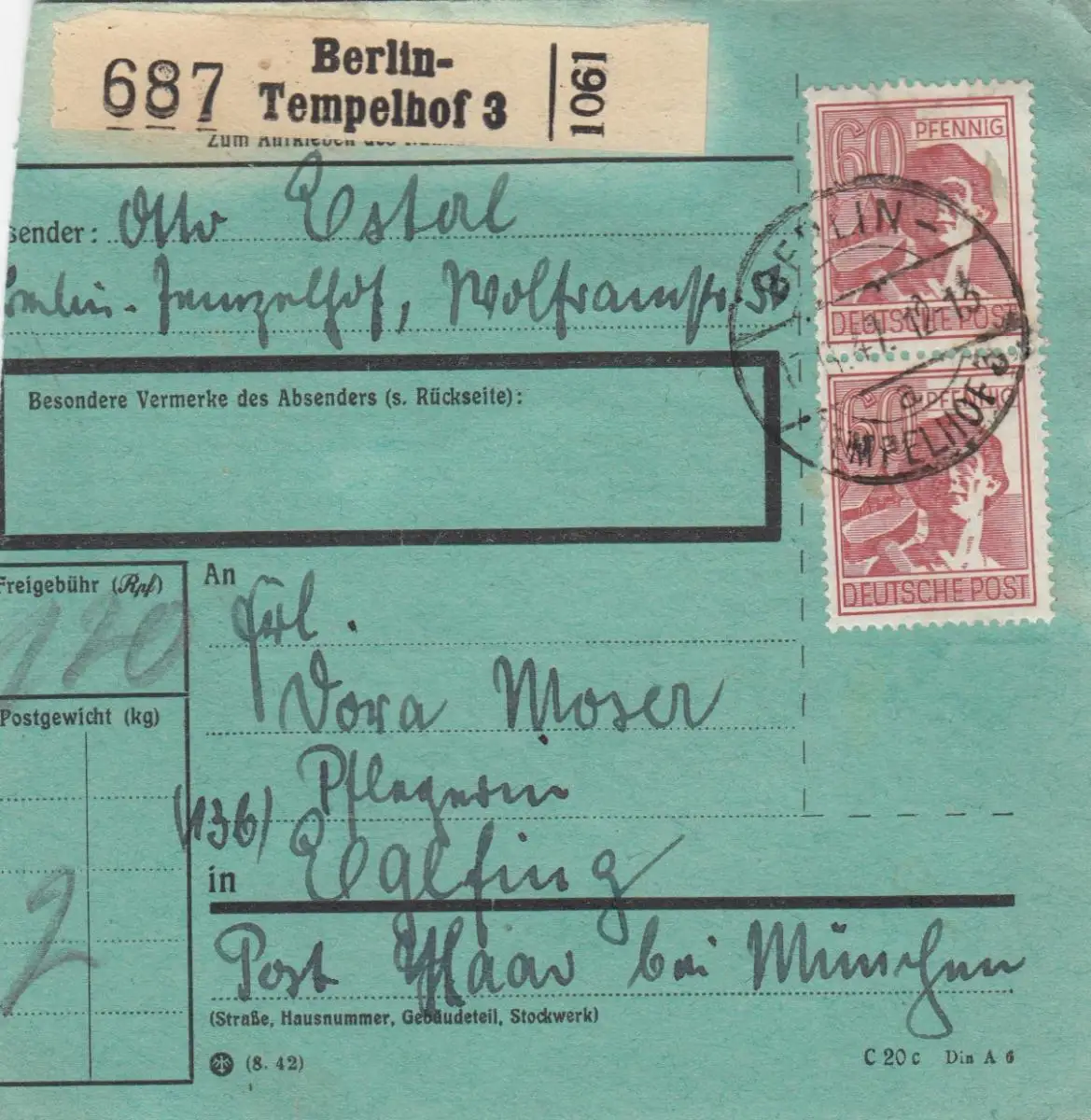 Carte de paquet 1947: Berlin-Tempelhof après Eglfing, formulaire spécial