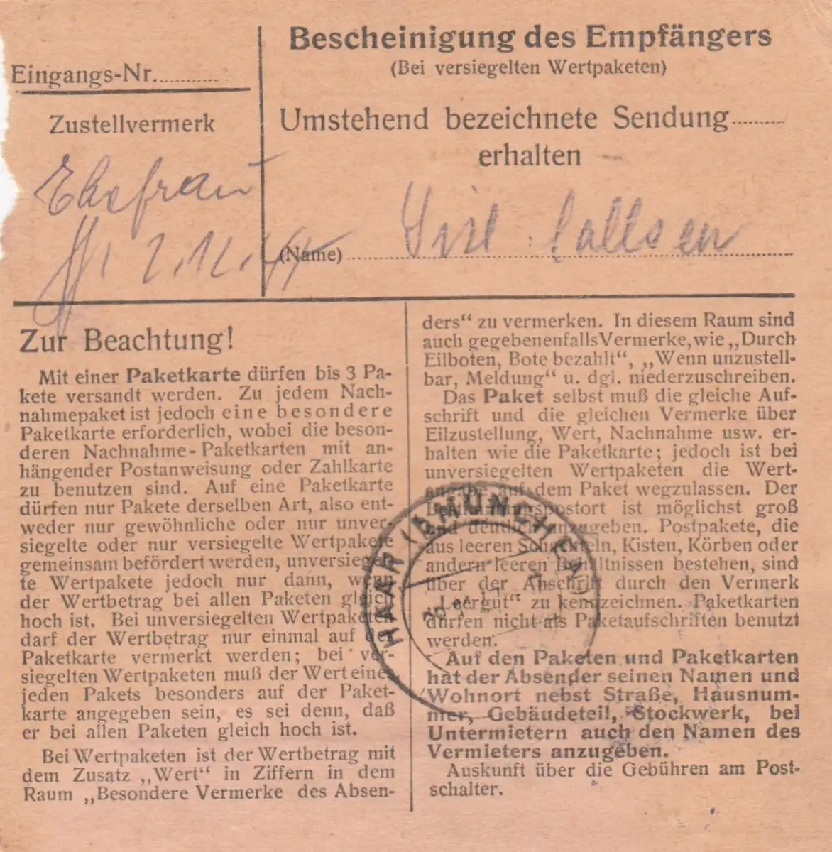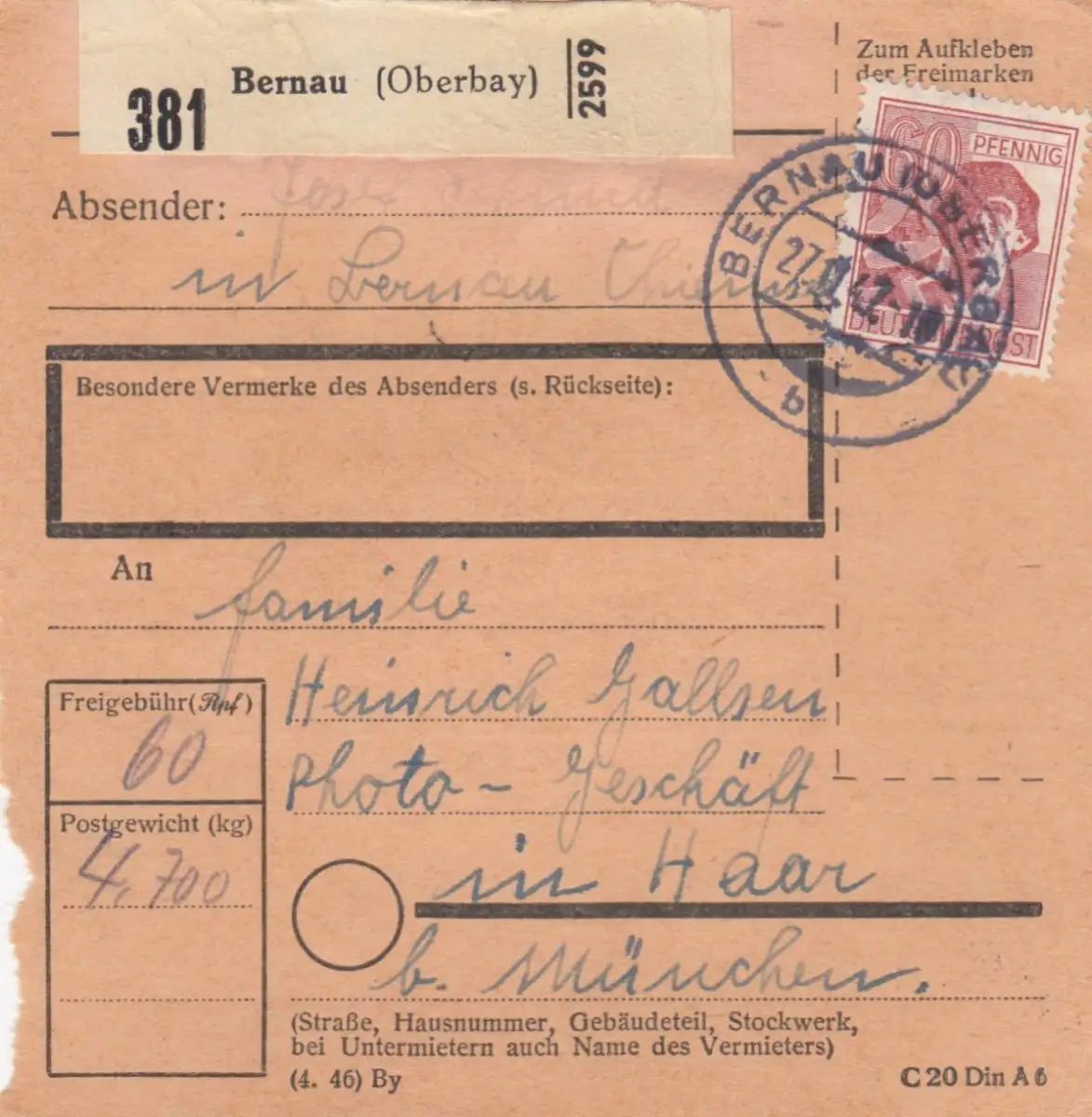 Carte de paquet 1947: Bernau après Haar, magasin de photos
