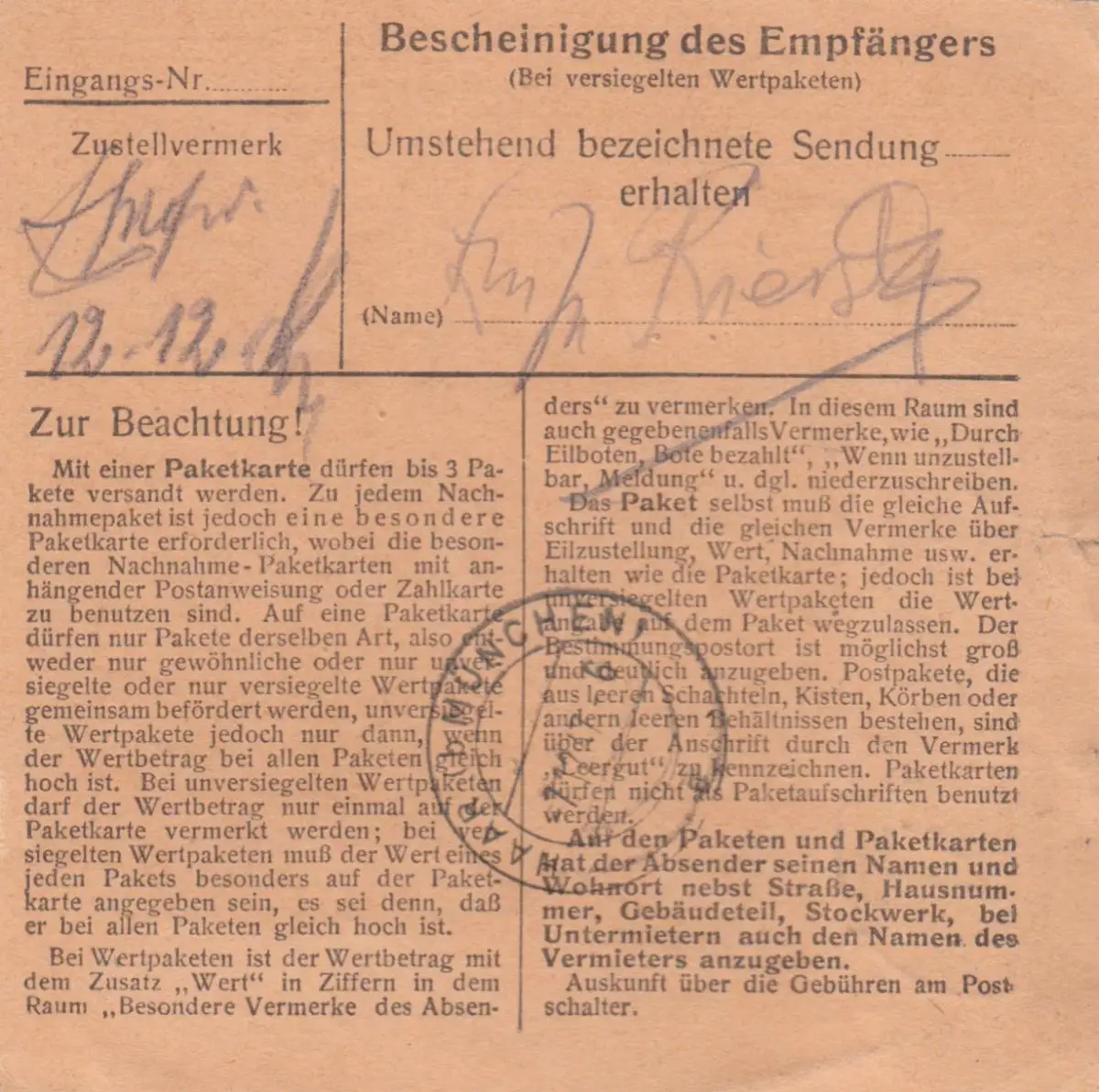 Carte de paquet 1947: Dominial-Kanzlei Schwarzenberg Schilderfeld, carte de valeur