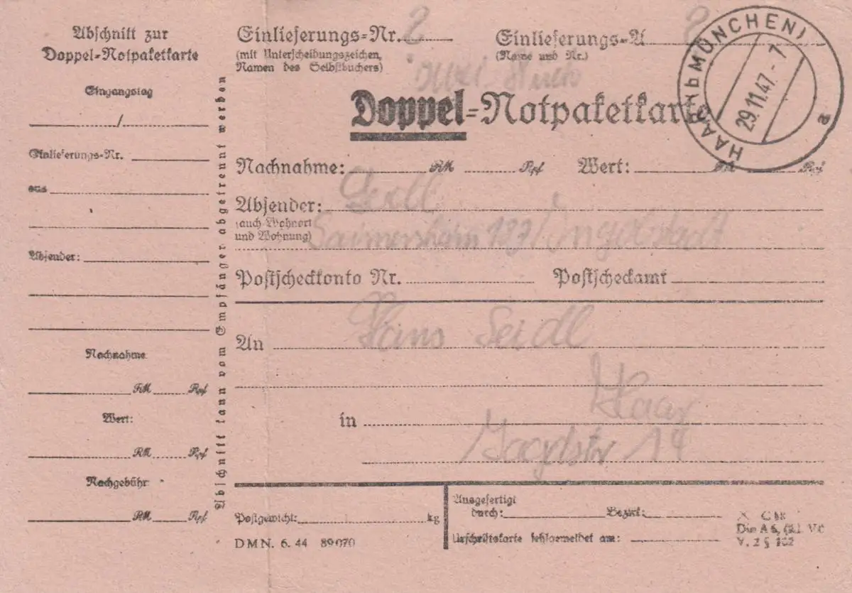 Carte de paquet 1947: Carte d'urgence double, Gaimersheim après les cheveux