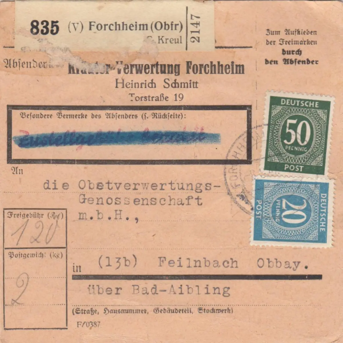 Carte de paquet 1947: Forchheim vers Feilnbach, Auto-booker