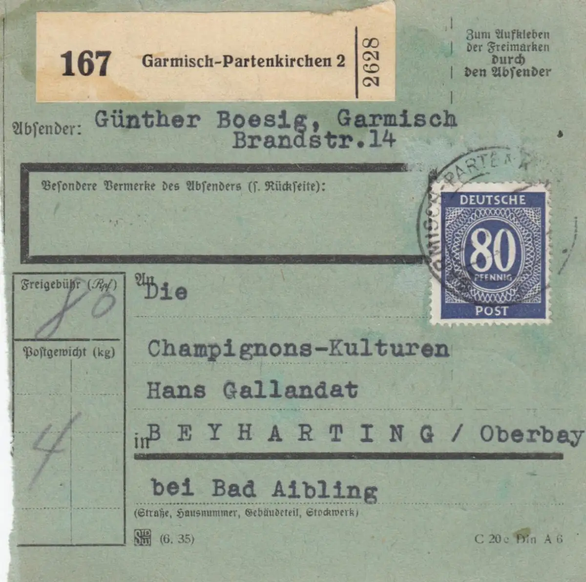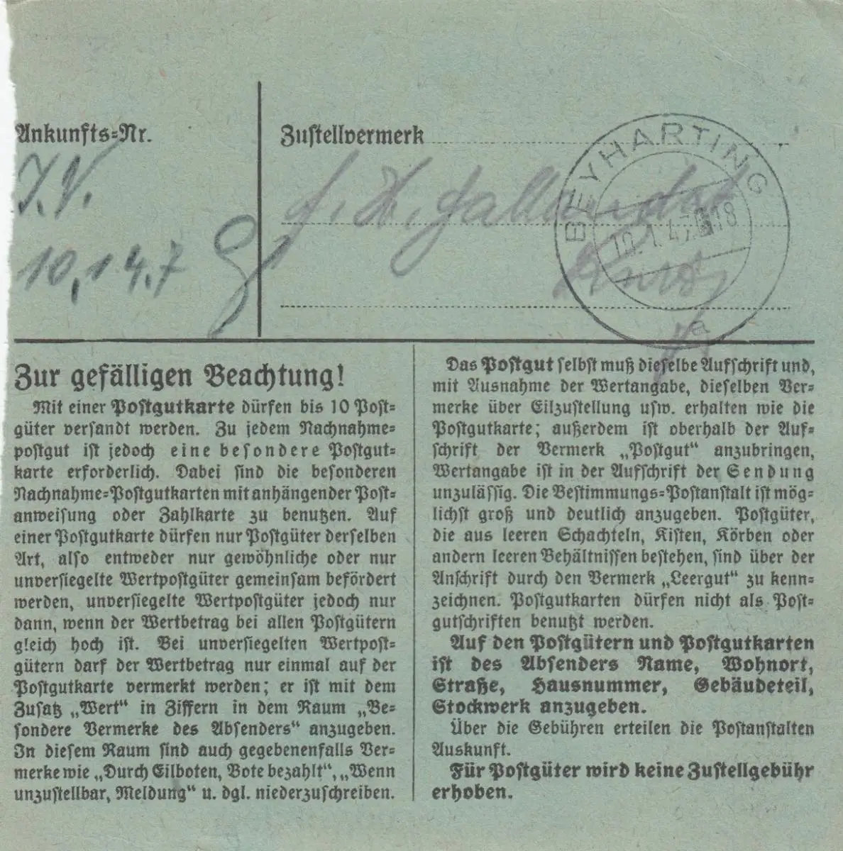 Carte de paquet 1947: Garmisch-Patenkirchen vers Beyharting, bes. Formualr