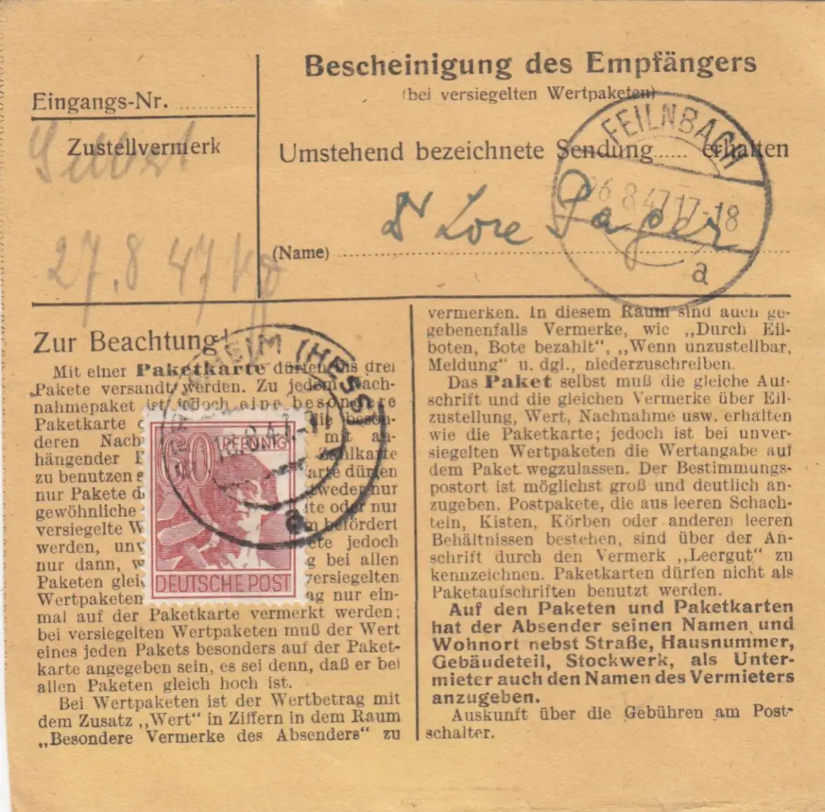 Carte de paquet 1947: Gernsheim vers Feilnbach, Lager Wendelstein