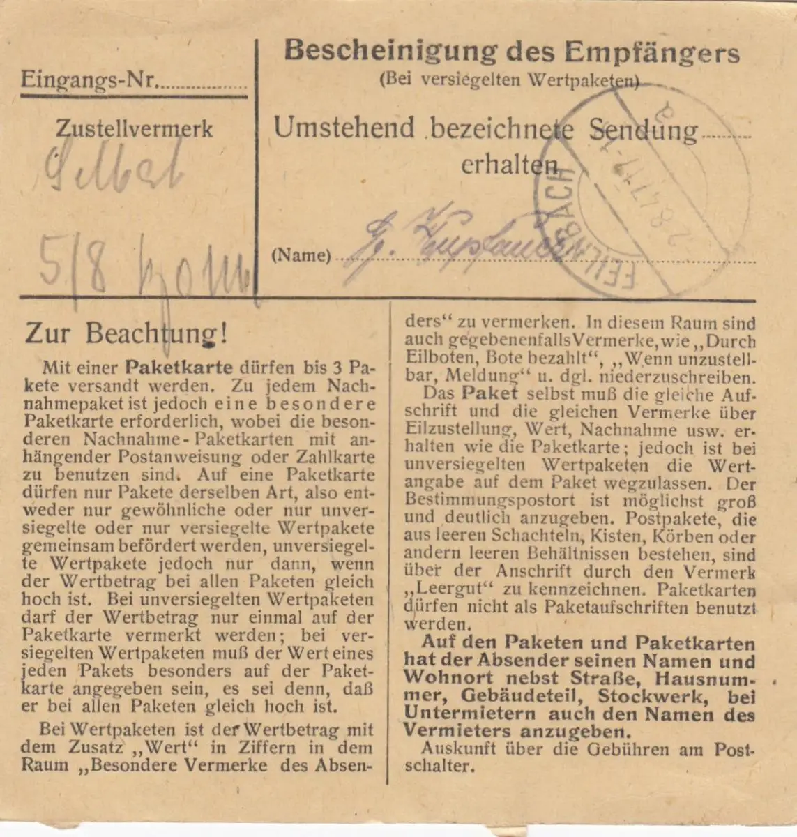 Carte de paquet 1947: Gröbenzell vers Feilnbach