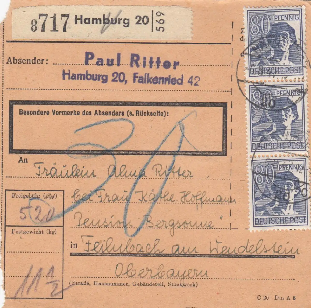 Carte de paquet 1947: Hambourg vers Feilnbach Wendelstein, supplément