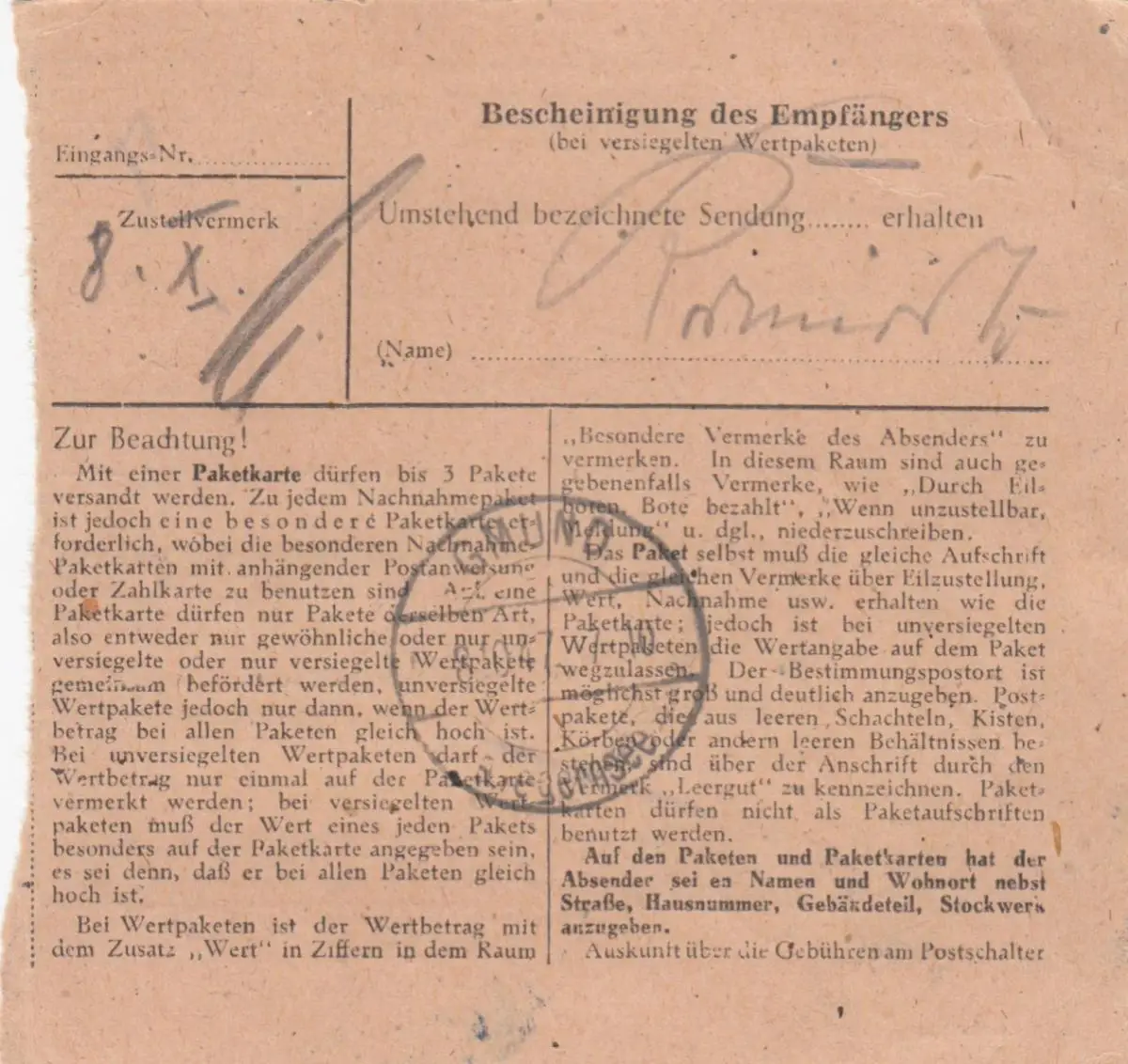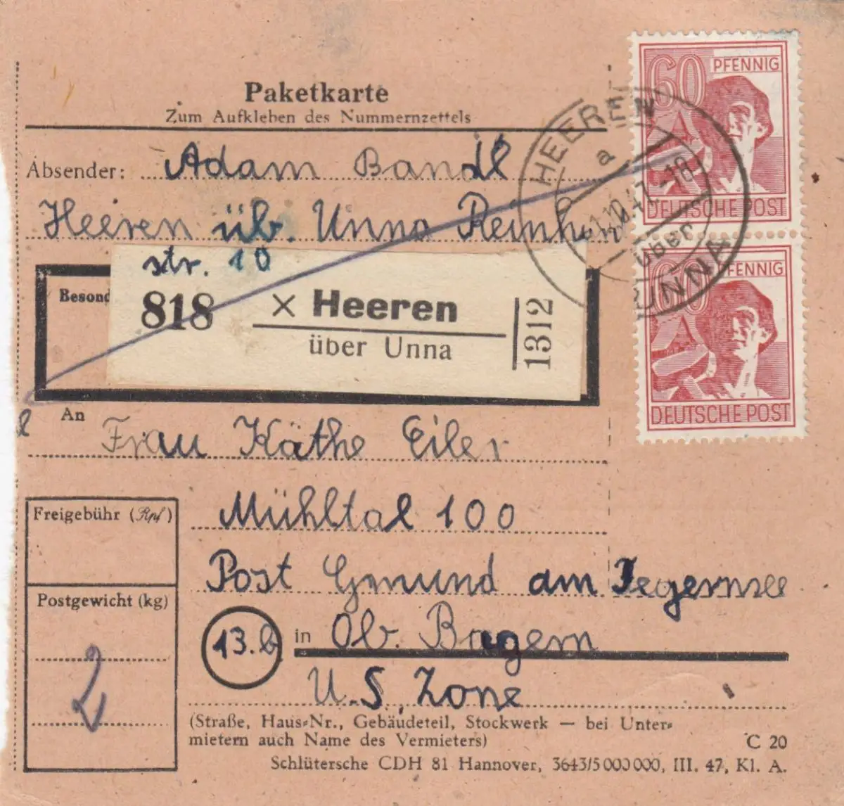 Carte de paquet 1947: armée par Unna vers Mühltal Post Gmund