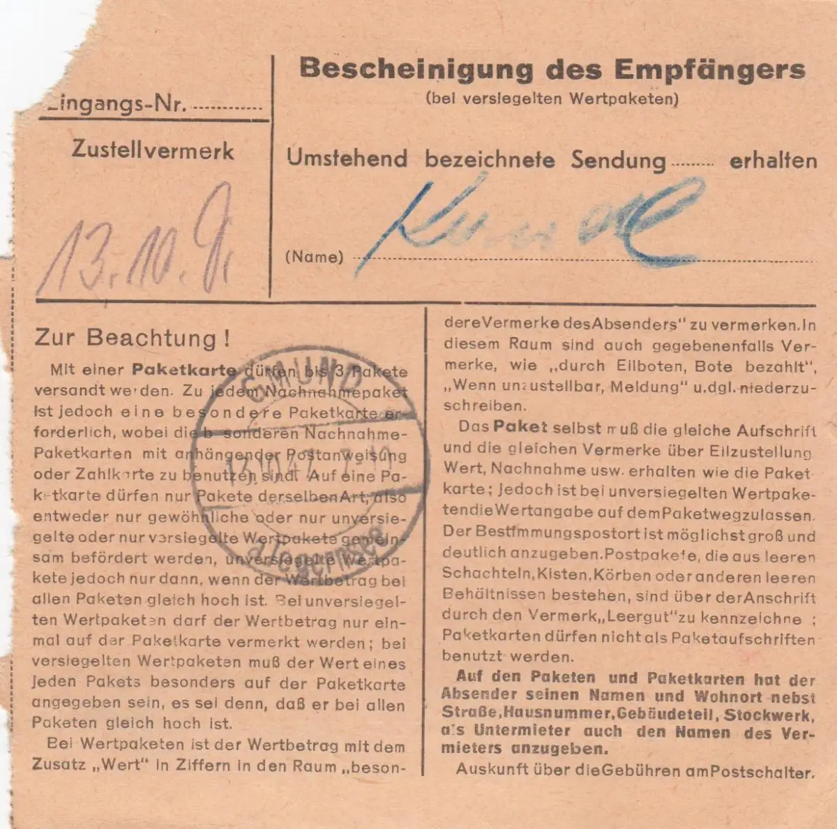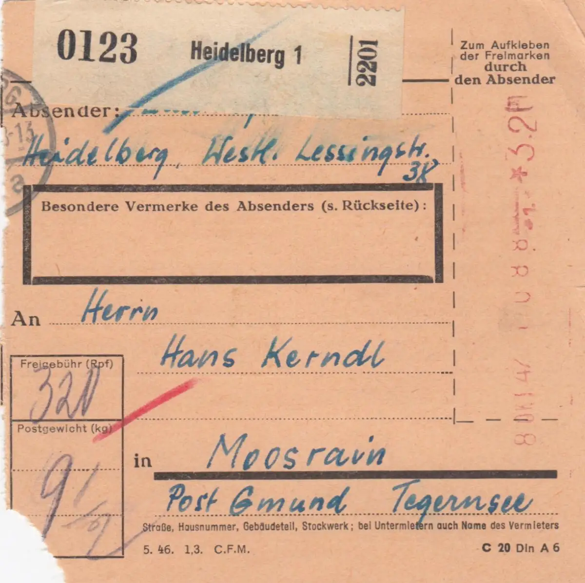 Carte de paquet 1947: Heidelberg vers Moosrain, Post Gmund