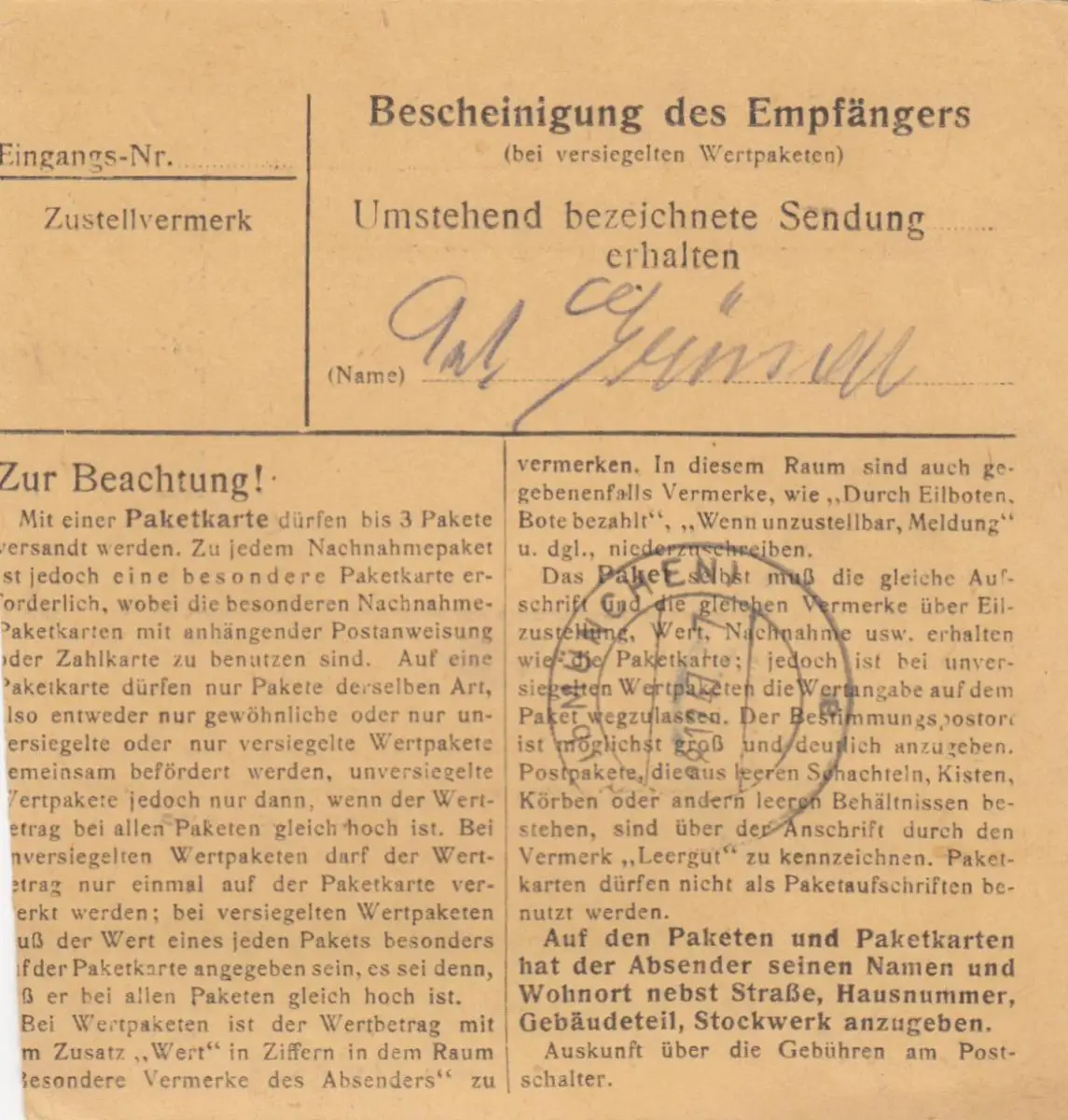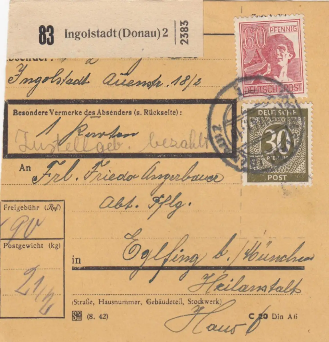 Carte de paquet 1947: Ingolstadt (Donau) vers Eglfing, 1 carton