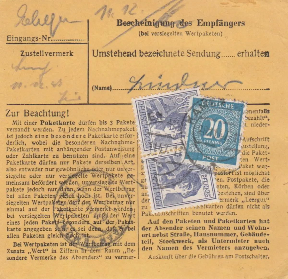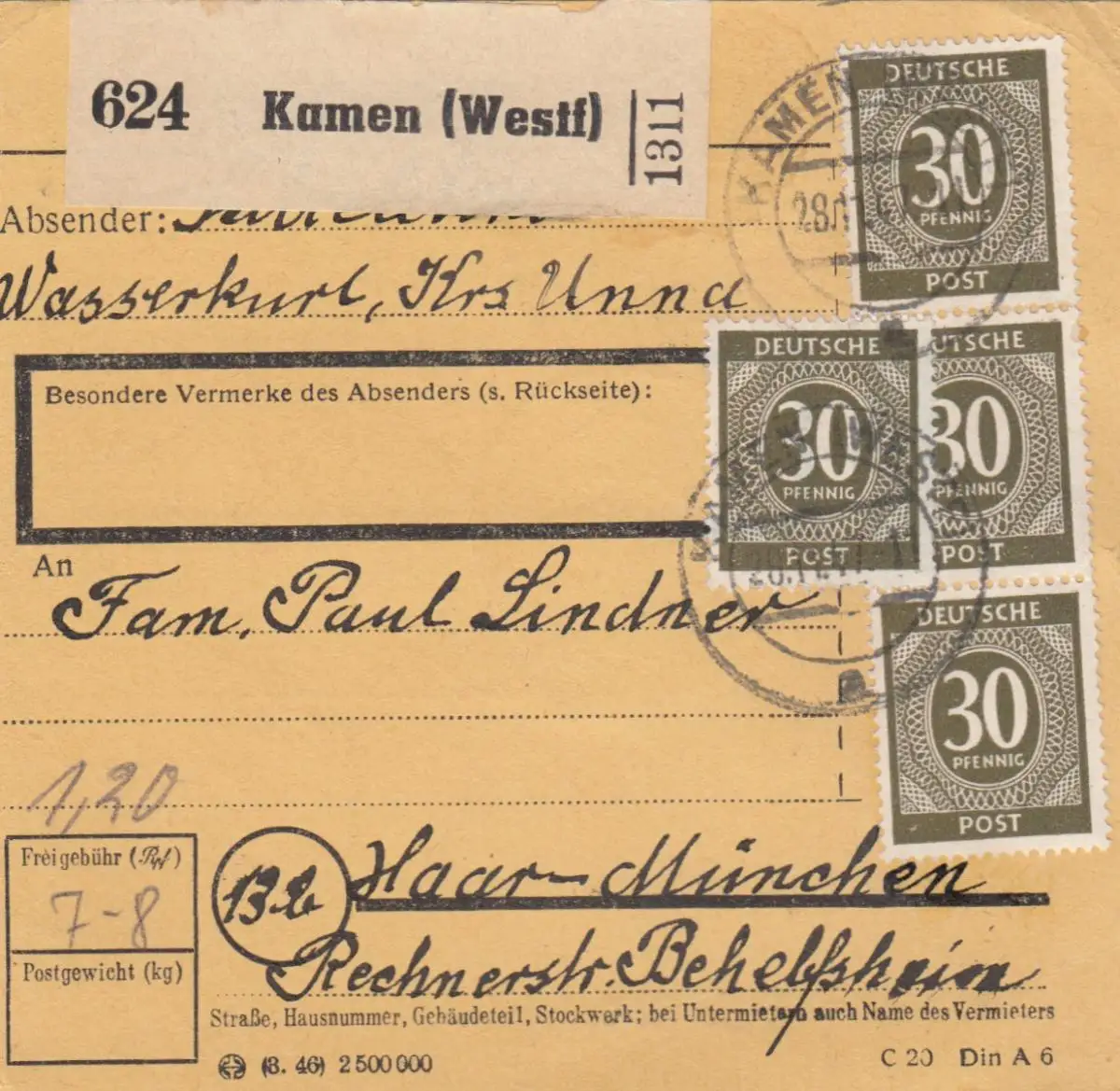 Carte de paquet 1947: Kamen Kreis Unna après les cheveux