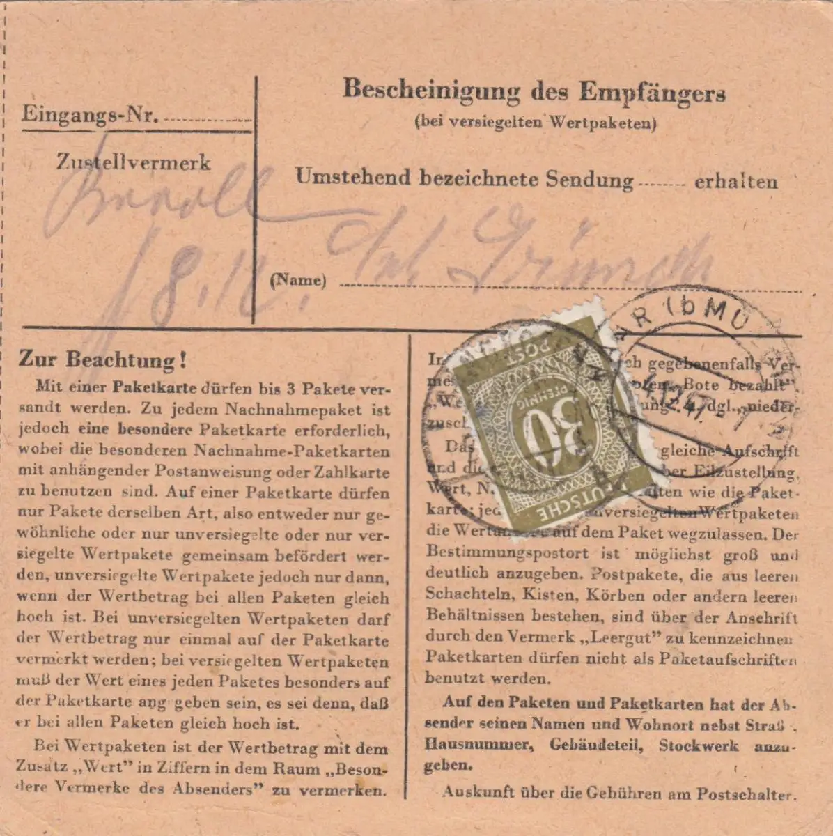 Carte de paquet 1947: Katterbach Gangkofen par cheveux, frais supplémentaires