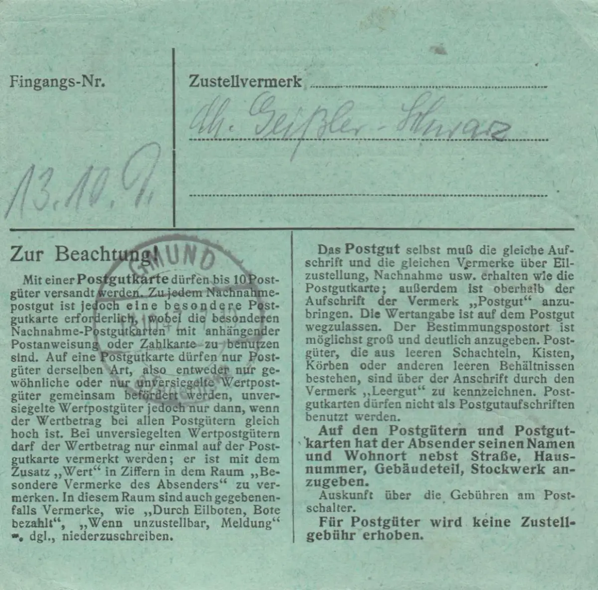 Carte de paquet 1947: Kirchheim Teck d'après Gmund a. Tegernsee, bes. Formulaire