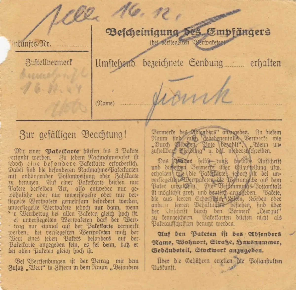 Carte de paquet 1947: Jettingen de Klingenburg par Haar