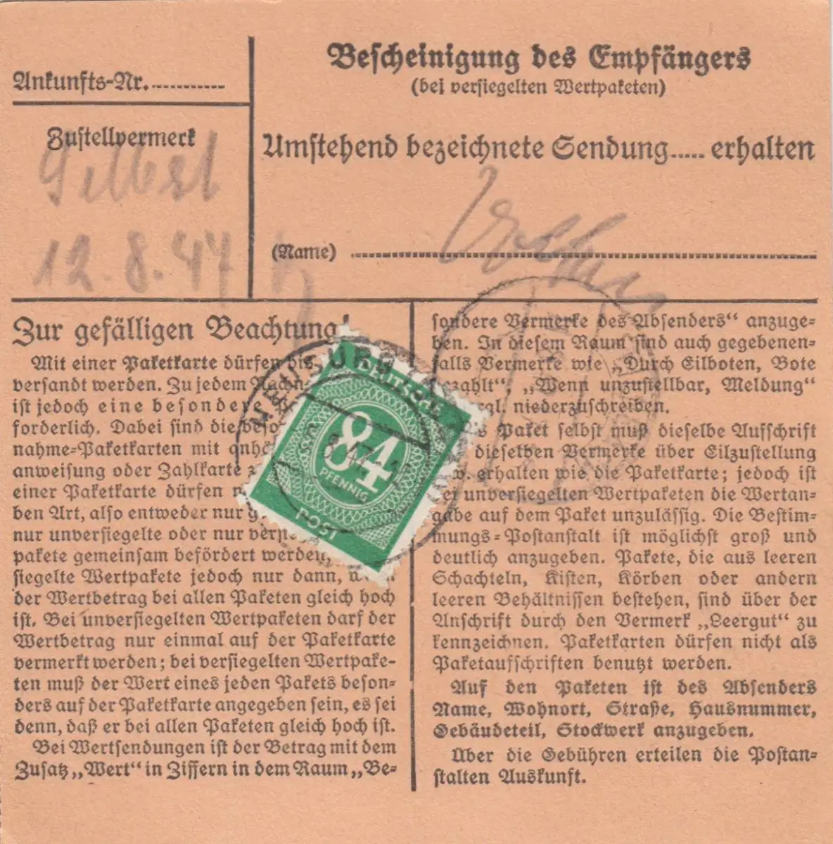 Carte de paquet 1947: Lederwaren Neuburg vers Feilnbach, carte de valeur