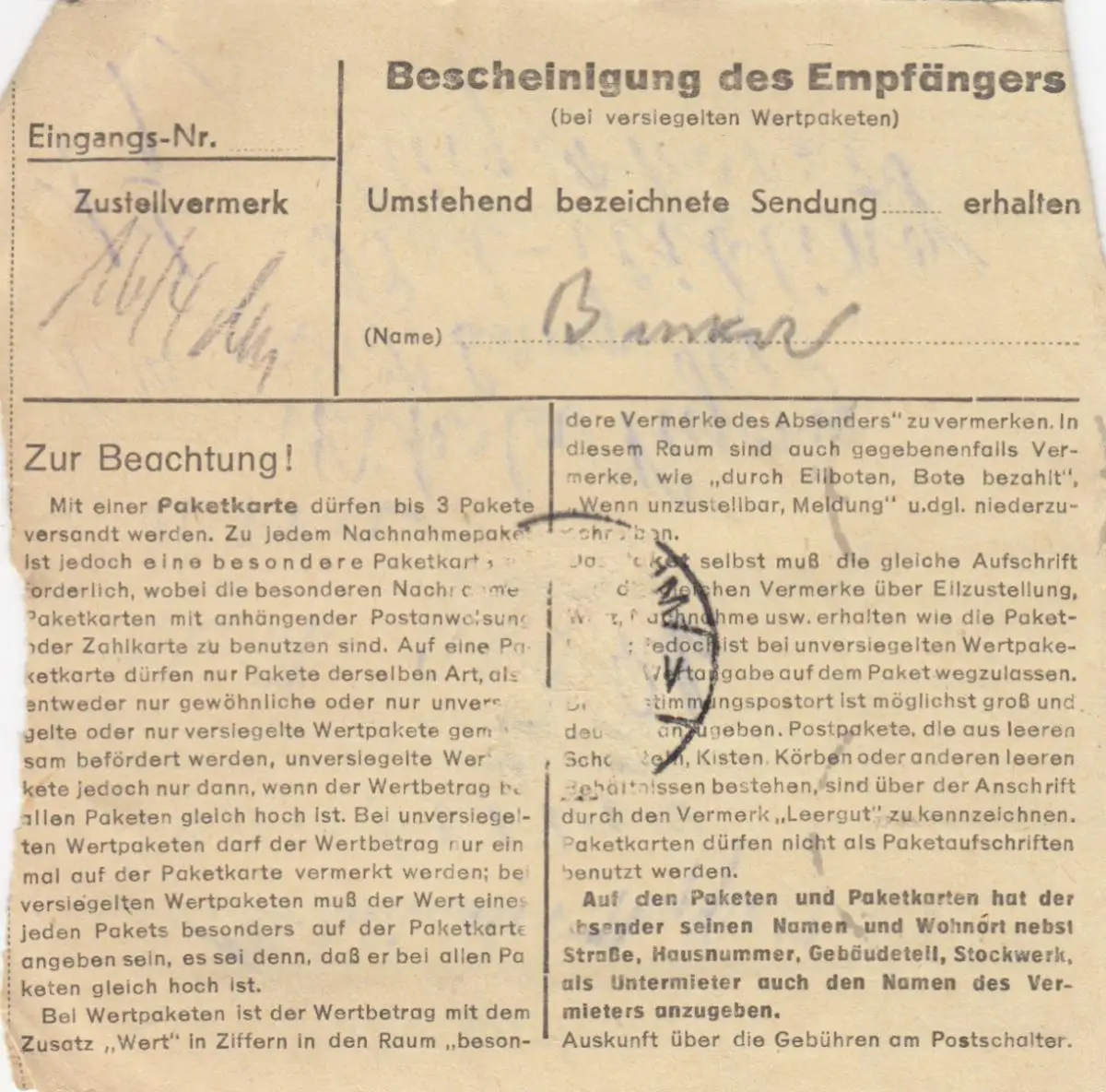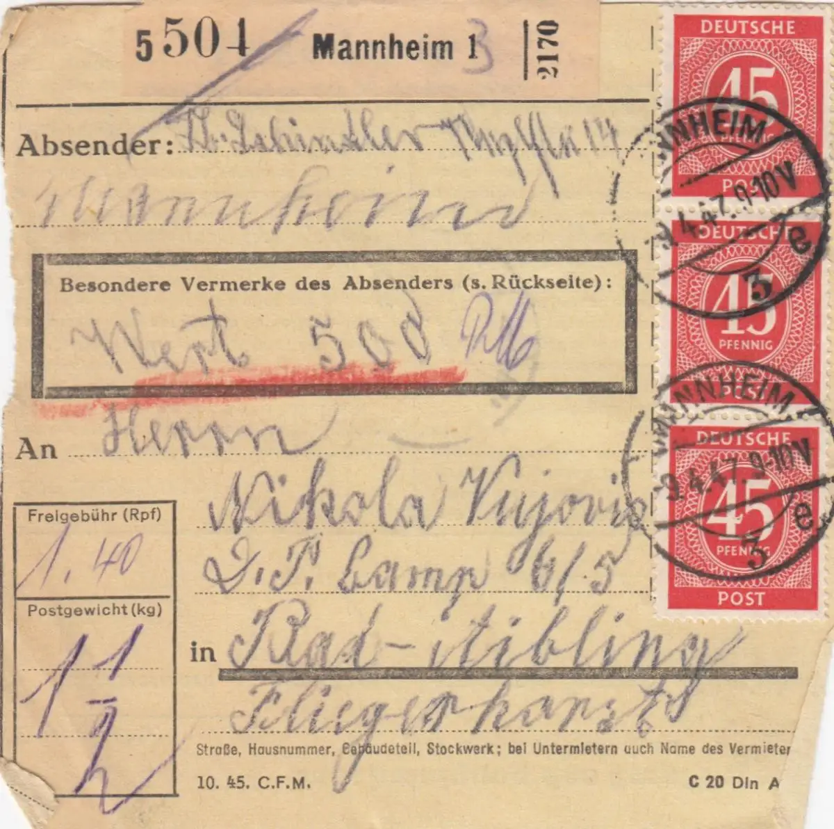 Carte de paquet 1947: Mannheim vers Bad-Aiblingen, valeur 500 RM