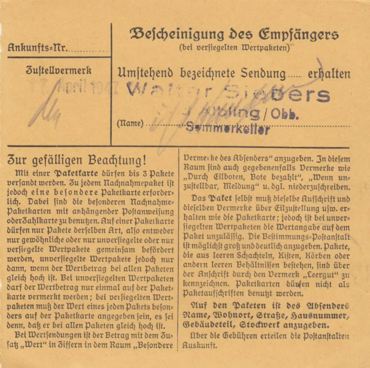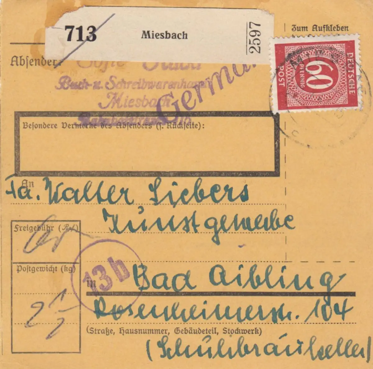 Carte de paquet 1947: Miesbach, Livreterie, après Bad Aibling, Arts et Artistes