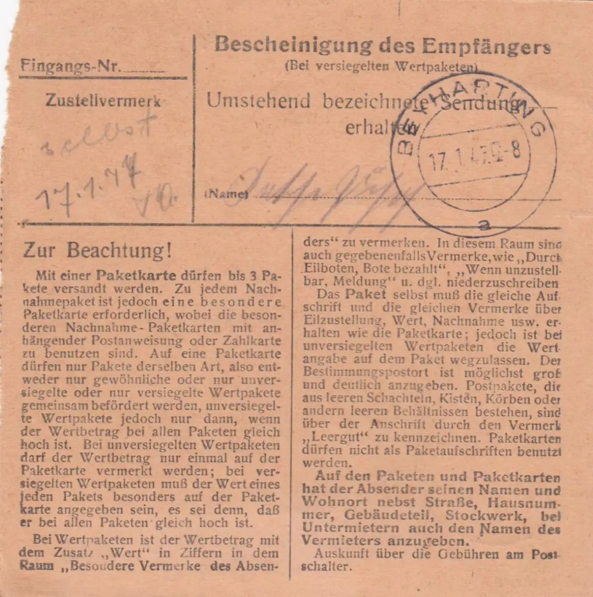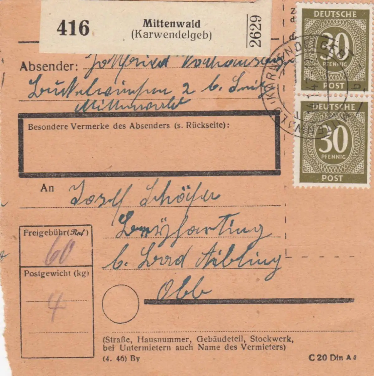 Carte de paquet 1947: Mittenwald vers Bad Aibling