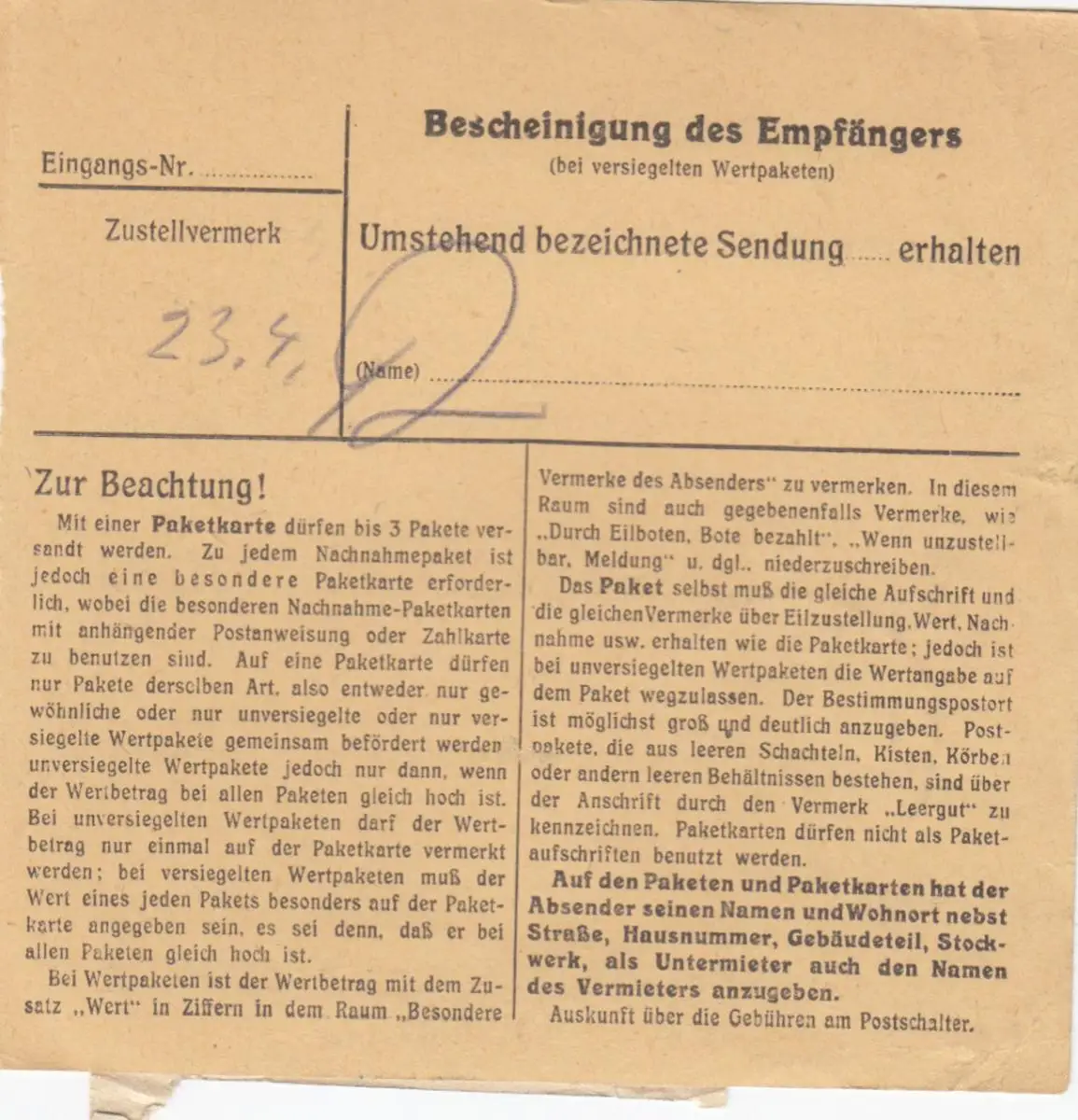 Carte de paquet 1947: Mitterteich, scieuse pour femmes, après Bad Aibling