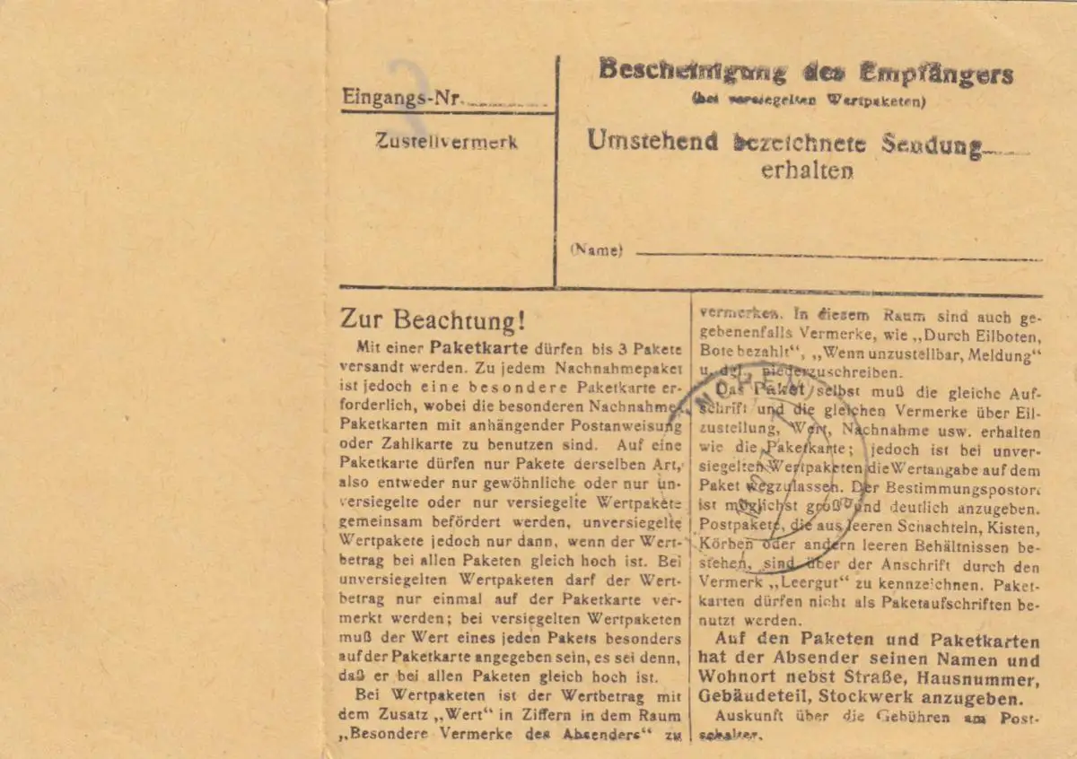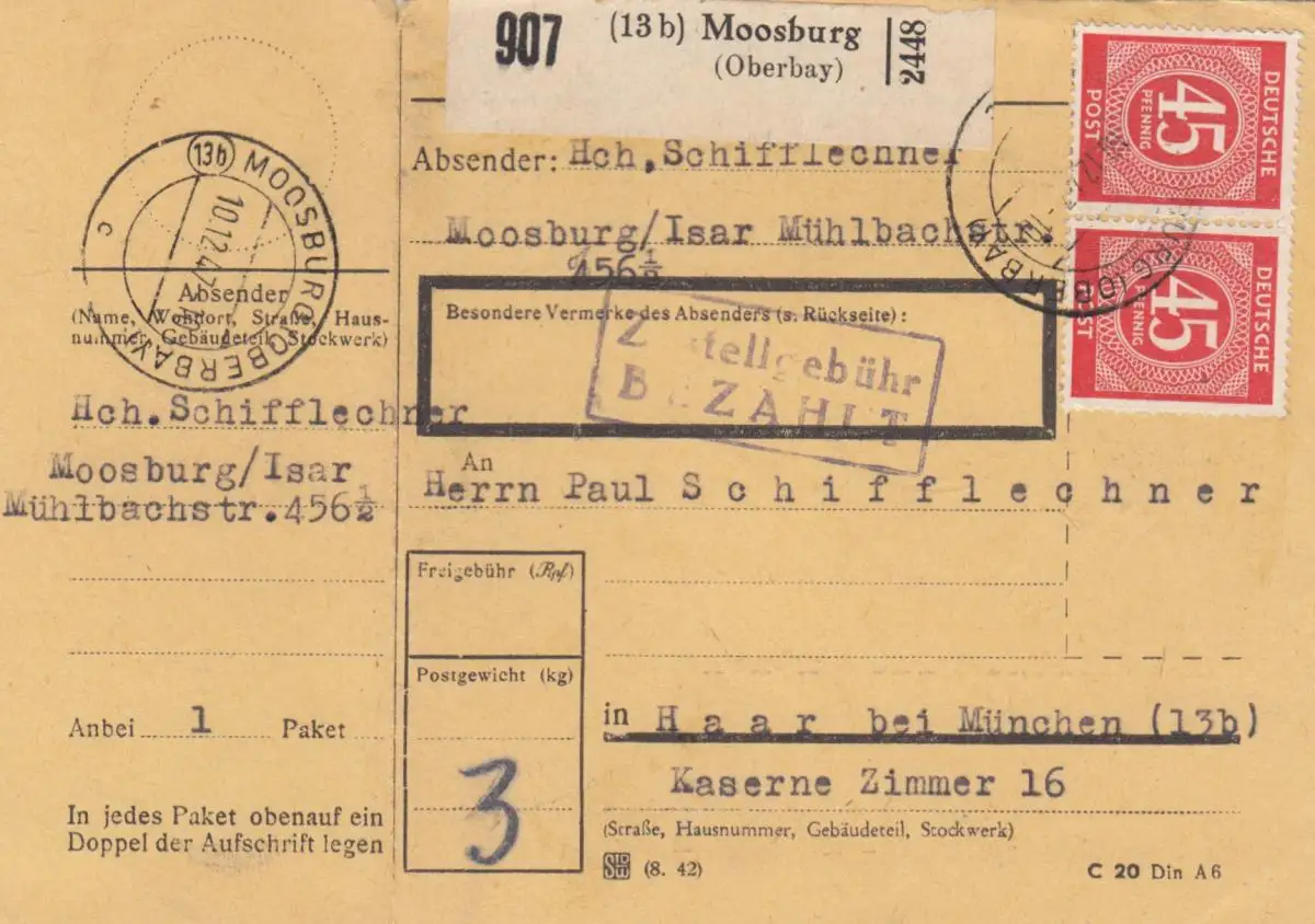 Carte de paquet 1947: Moosburg Isar par cheveux, Chambre Caserne 16