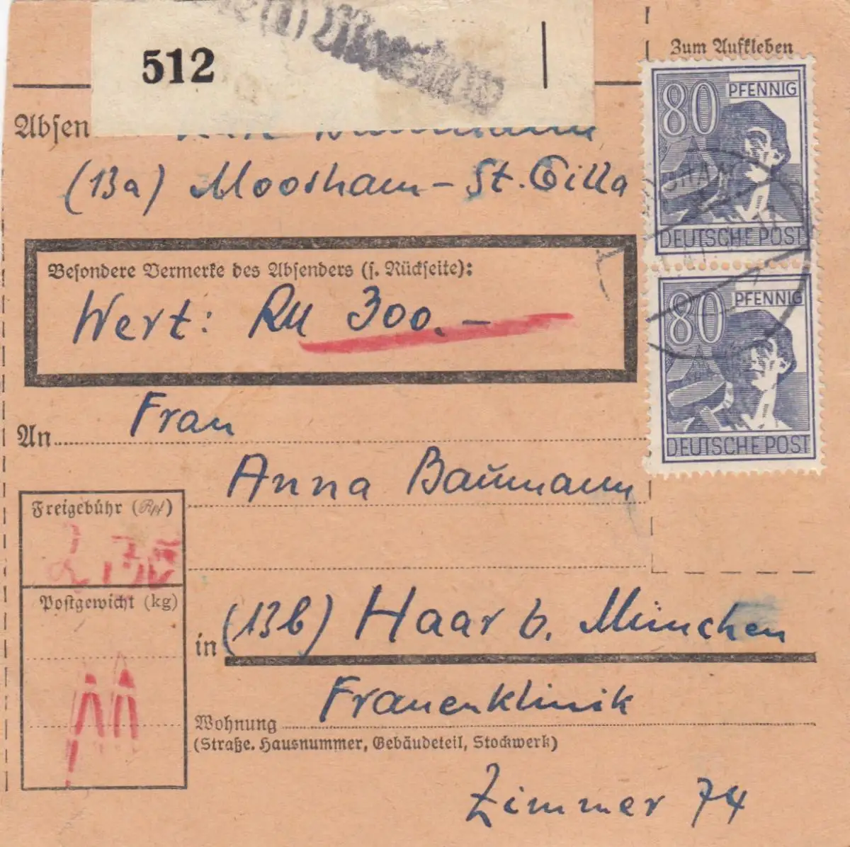 Carte de paquet 1947: Moosham St. Gilla par cheveux, clinique féminine, carte de valeur