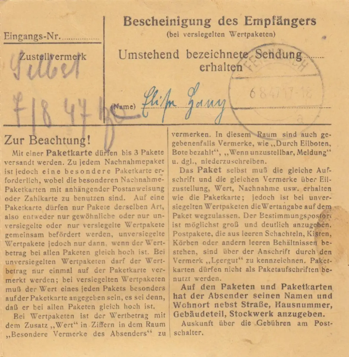 Carte de paquet 1947: Oberammergau vers Am Auerberg, Feilnbach